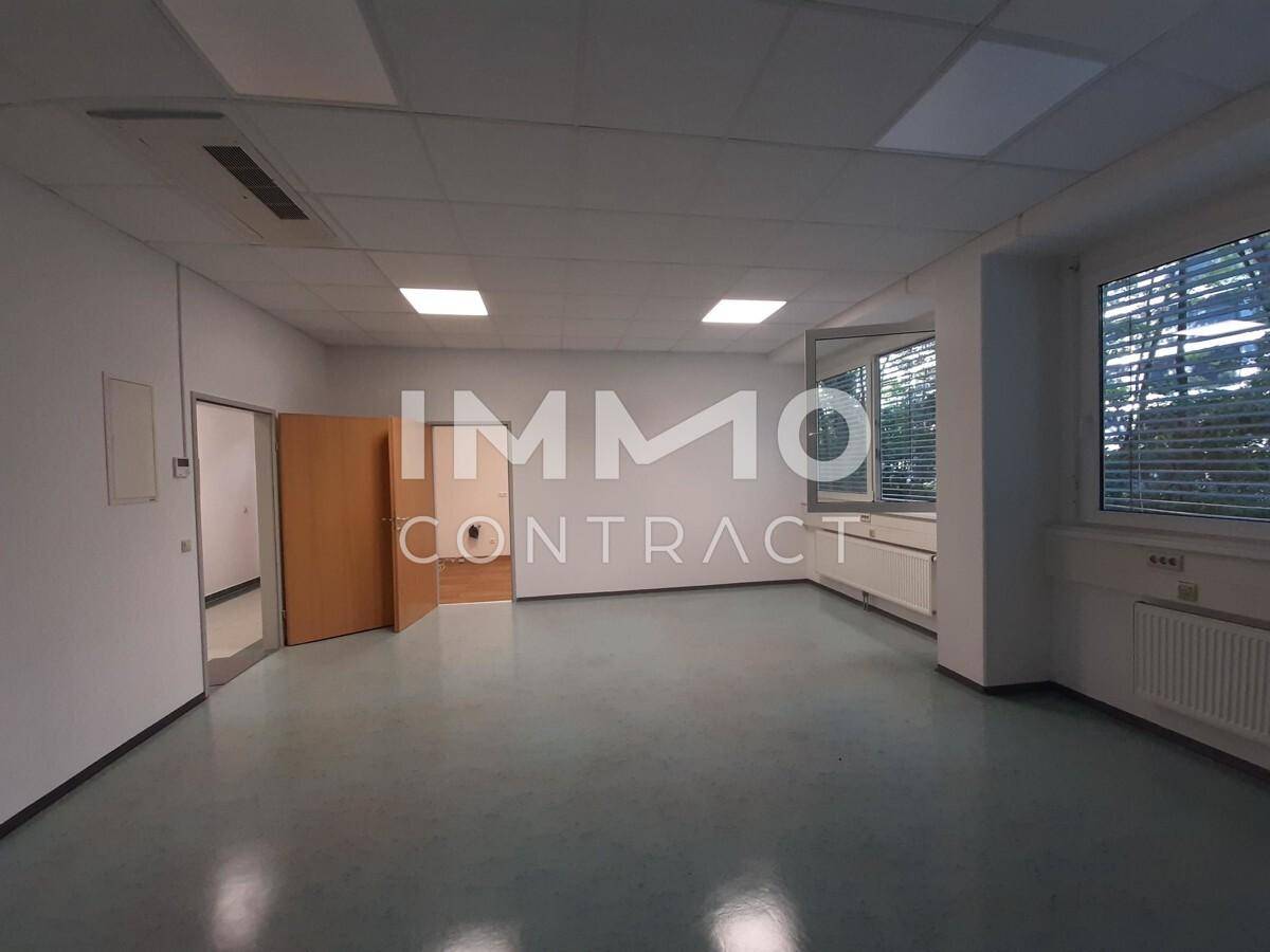 Das ca. 62,29 m² große Büro befindet sich im Erdgeschoss des Gebäudes und ist auf 2 Räume mit Verbindungstüren geteilt. In einem Raum ist ein Laminatboden verlegt, sowie ein Wasseranschluss vorhanden. Die Räume können sowohl gekühlt (Deckenkühlgeräte) als auch beheizt werden. Da sich die Fenster des Büros auf der Nordwestseite des Gebäudes befinden, kann vor allem im Sommer von einem angenehmen Klima und einen tollen Blick auf die Bäume profitiert werden.