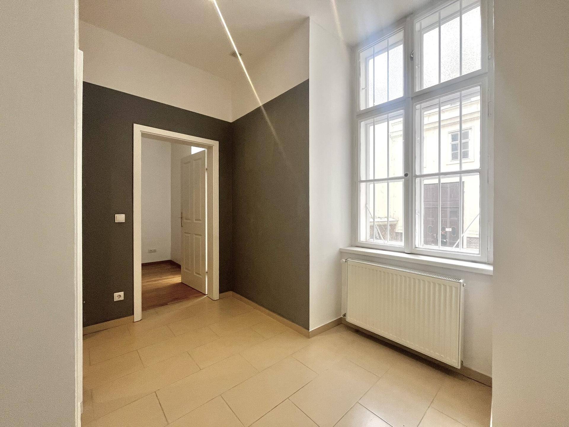 Der Vorraum ist geräumig und einladend. Das Bad mit WC sind modern gestaltet, verfügen über ein Fenster und einen Anschluss für eine Waschmaschine. Die Wohnung bietet zudem ein Durchgangszimmer und einen großzügigen Wohnbereich mit hohen Altbaufenstern, die einen schönen Blick ins Grüne ermöglichen. Die Wohnung wird frisch ausgemalt übergeben.