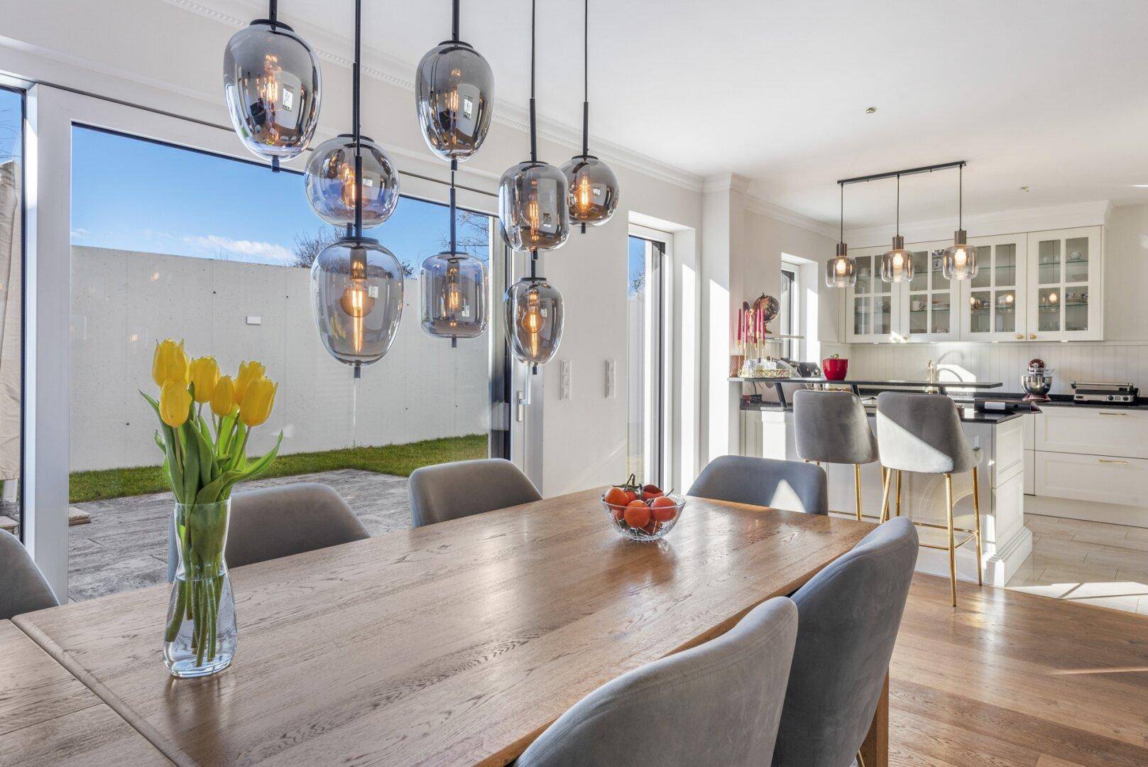 Das Entreé ist einladend und gibt bereits den Blick ins Grün frei. Denn hier im Erdgeschoß (ca. 60 qm) ist der gesamte Wohn-Essbereich inklusive Küche Richtung Garten ausgerichtet. Ein Hebe-Schiebeelement ermöglicht es an warmen Tagen, die mit italienischem Stein ausgelegte Terrasse mit in den Wohbereich einzubinden. Privatsphäre ist hier garantiert.