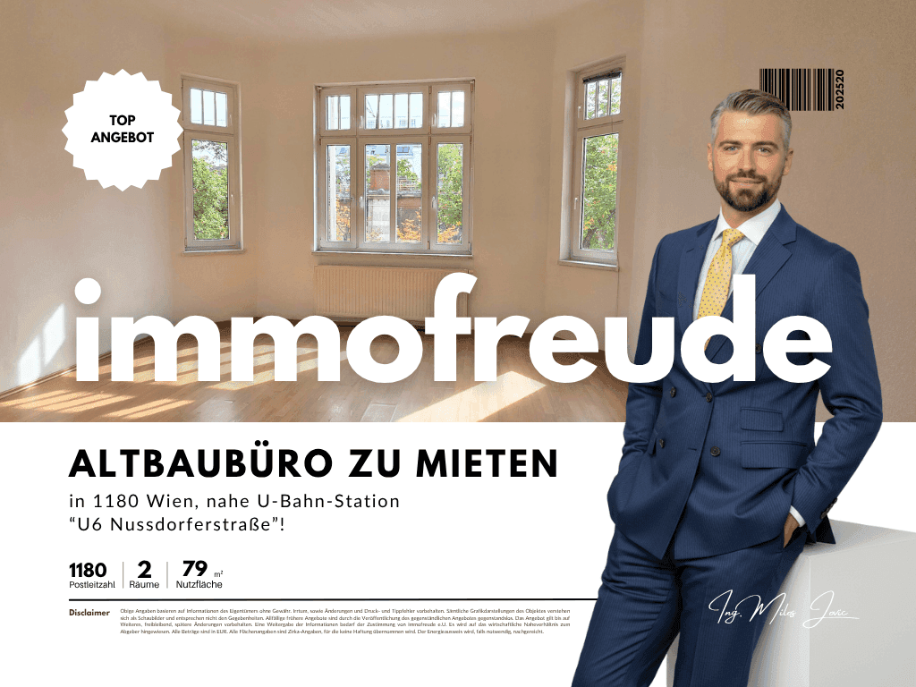 ein Ort, der durch seine klare Struktur, angenehme Raumwirkung und ausgezeichnete Lage überzeugt. Auf rund 79 m² Nutzfläche bietet die Einheit ein freundliches, funktionales Umfeld für konzentriertes Arbeiten in klassischem Wiener Altbauambiente.