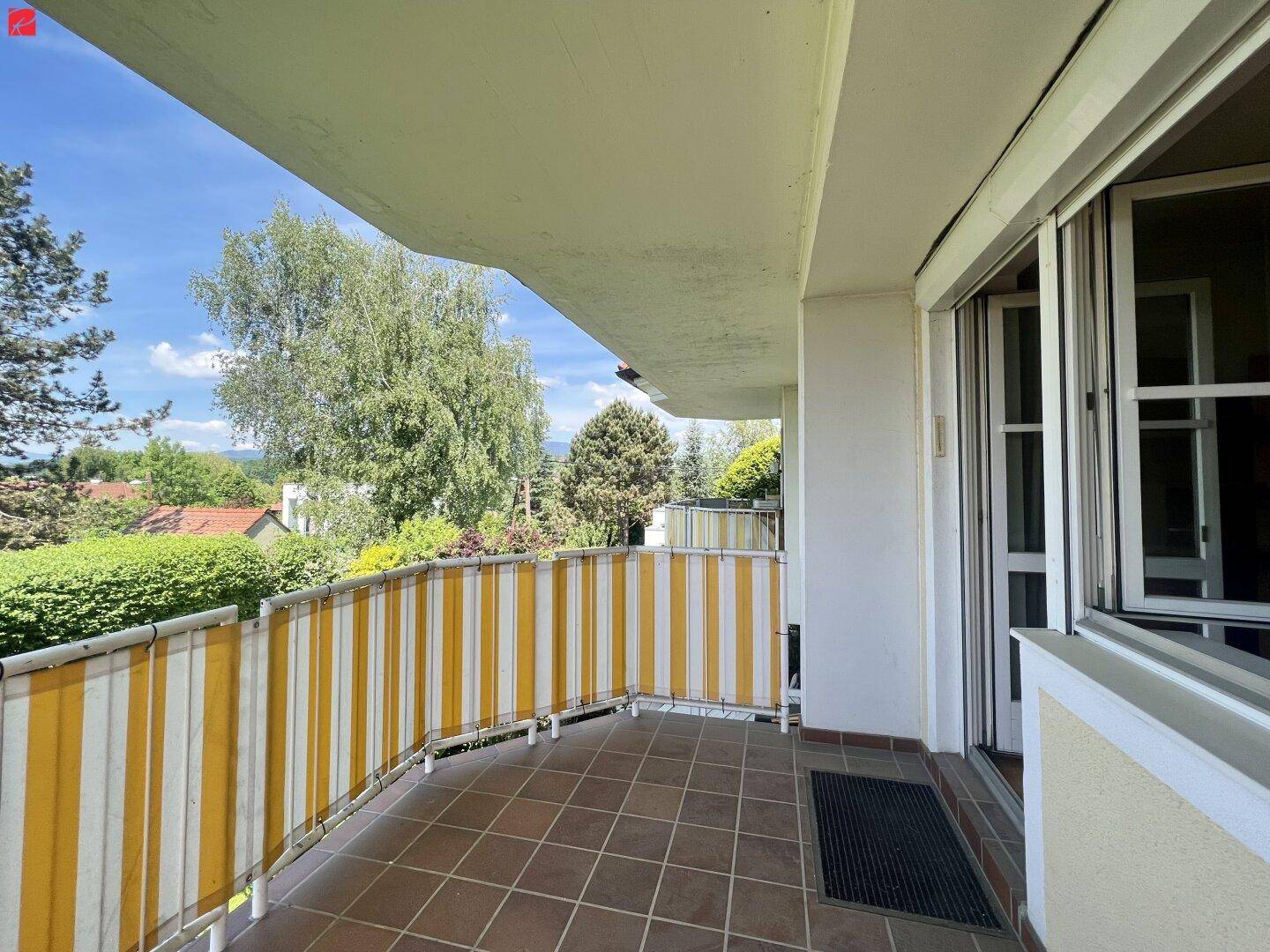 Der großzügige Balkon ist das Highlight der Wohnung. Er bietet Ihnen einige ruhige Abendstunden mit Blick ins Grüne und auf die umliegenden Berge.