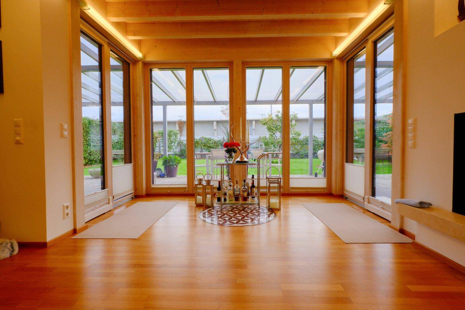 Die Innenausstattung ist ideal abgestimmt durch die Auswahl von großen hellen Fliesen in der Kombination mit einem Parkettboden aus Buche.