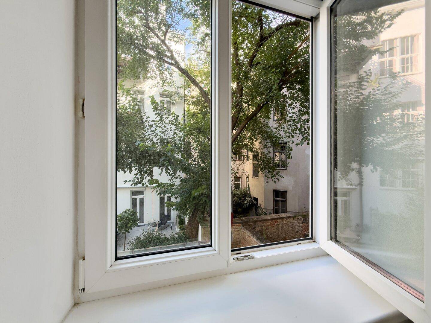 Wohn-/Schlafzimmer – ruhig zum begrünten Innenhof ausgerichtet, hell und gemütlich – der perfekte Rückzugsort mitten in der Stadt.
