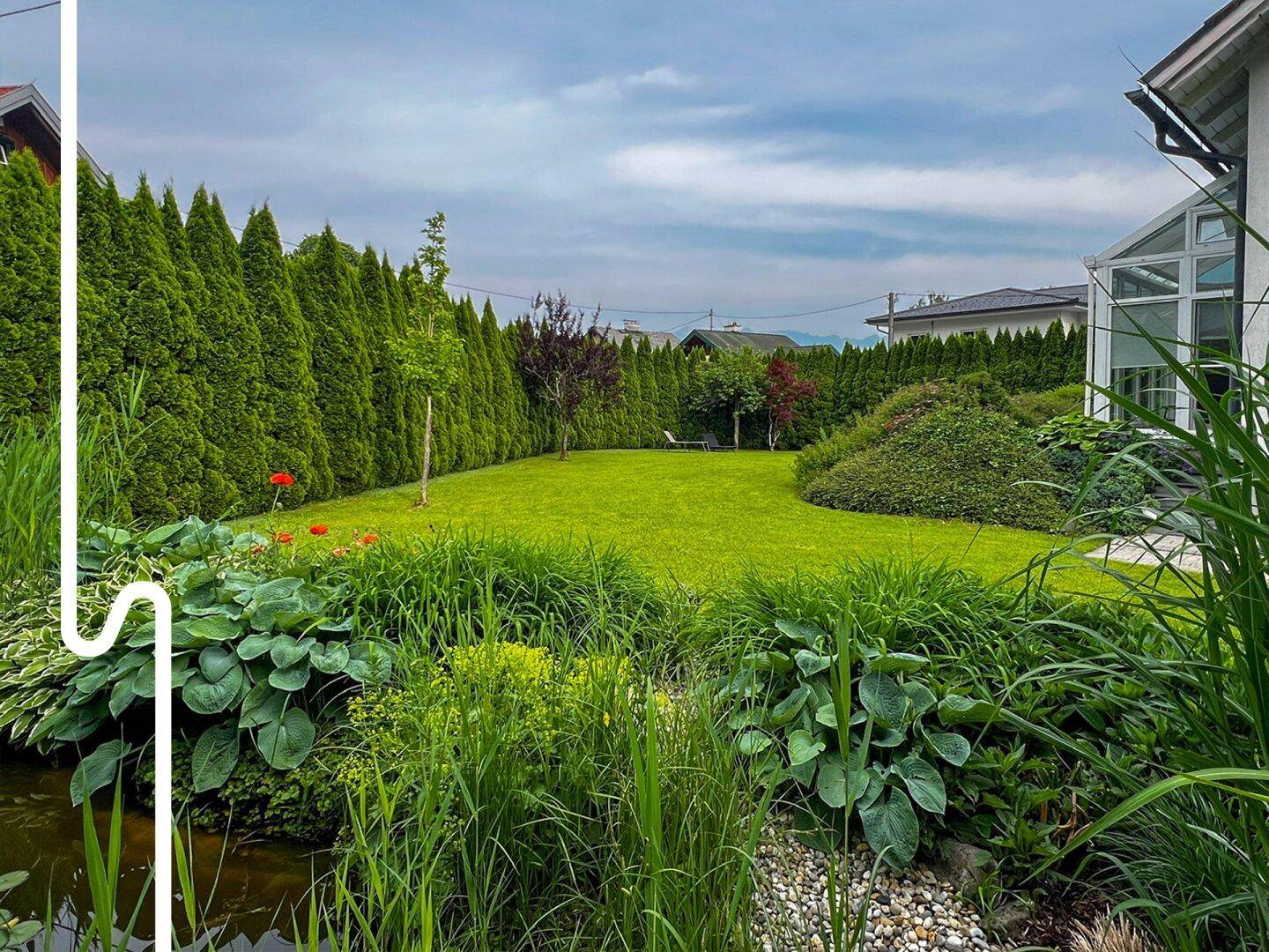 Rund um das Haus zieht sich ein uneinsehbarer Garten. Ein idyllisches Biotop mit Goldfischen, großzügige Grünflächen und sonnige Terrassen schaffen Raum für Ruhe und Genuss.