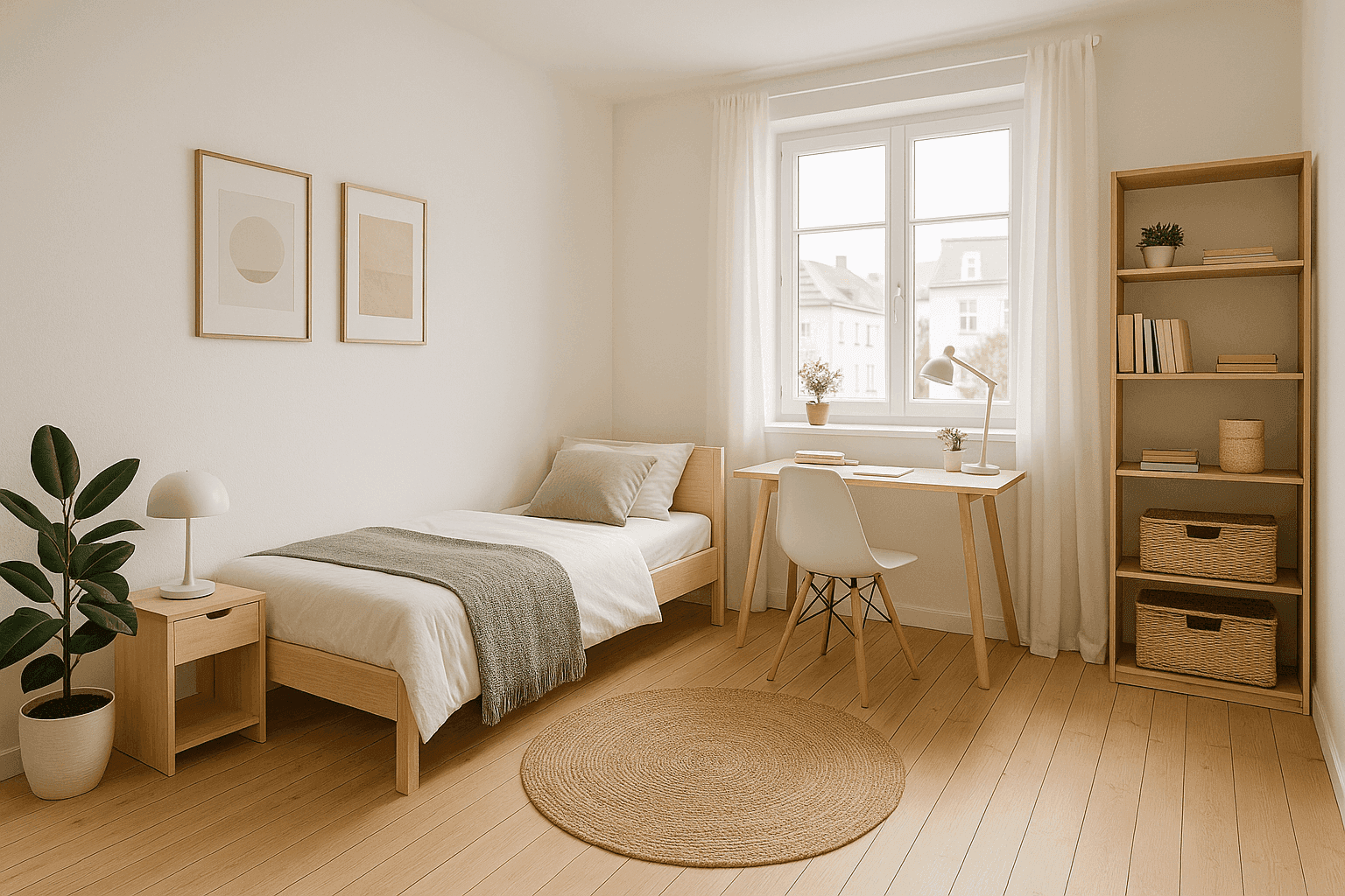 Das Zimmer ist voll möbliert und mit viel Liebe im skandinavischen Stil eingerichtet: Einzelbett mit Stauraum Schreibtisch & Stuhl – ideal zum Lernen oder Arbeiten Regal & Kleiderschrank Helle Holzmöbel für ein freundliches Wohngefühl
