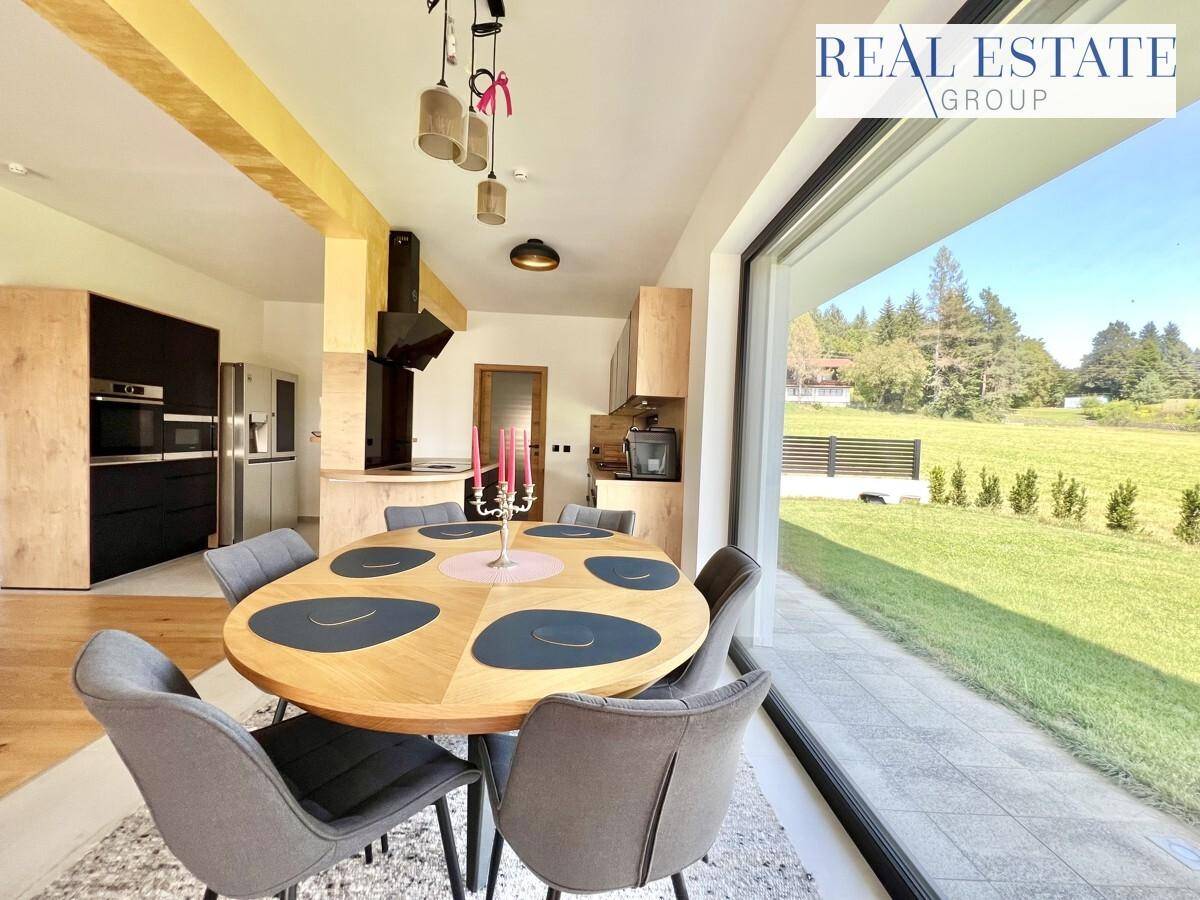 Dieses exklusive Einfamilienhaus liegt eingebettet in der Natur, nur drei Fahrminuten vom malerischen Wörthersee entfernt. Umgeben von Wäldern und Wiesen, bietet dieses Anwesen auf einem Grundstück von ca. 605 m2 eine Oase der Ruhe und Erholung. Das Haus besticht durch eine Wohnfläche von ca. 177m2, die mit hochwertigen Materialien und einzigartigen Details gestaltet wurde. Schon der beeindruckende Eingangsbereich, verziert mit einer individuellen Maltechnik an den Wänden, vermittelt den besonderen Charme dieses Hauses.