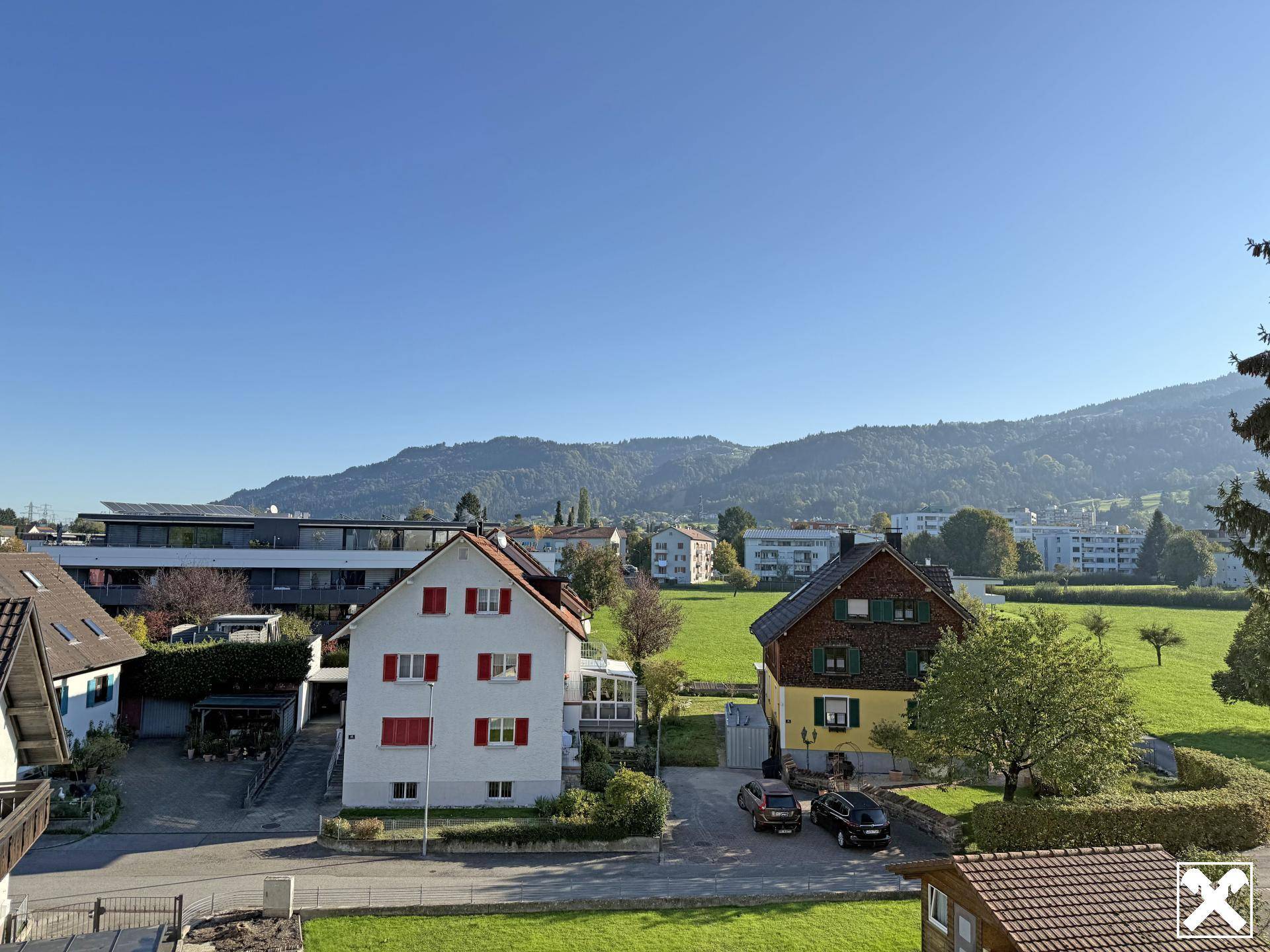 Die Küche und das Wohnzimmer mit dem vorgelagerten Balkon bestechen durch den wunderbaren Blick auf den Pfänder.