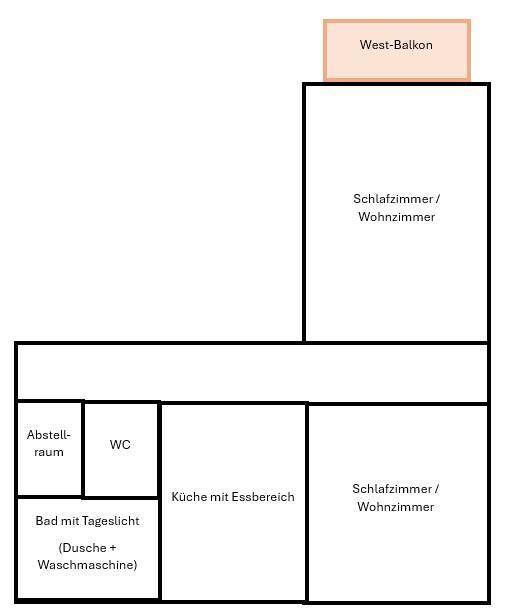 Die Wohnung hat ein Zimmer mit Ostausrichtung und ein Zimmer mit Balkon und Westausrichtung in den Innenhof (beide Räume sind getrennt begehbar und somit auch WG-fähig). Die Küche und das Badezimmer (mit Tageslicht und Fenster) sind ebenso ostseitig ausgerichtet. Die Küche ist mit einer holzfarbenen Einbauküche mit Herd, Kühlschrank sowie Geschirrspüler ausgestattet und bietet auch Platz für eine Sitzecke. Es gibt desweiteren ein getrenntes WC sowie einen Abstellraum. Ebenso gibt es ein kleines Durchgangszimmer, welches sich ideal als begehbarer Kleiderschrank verwenden lässt.