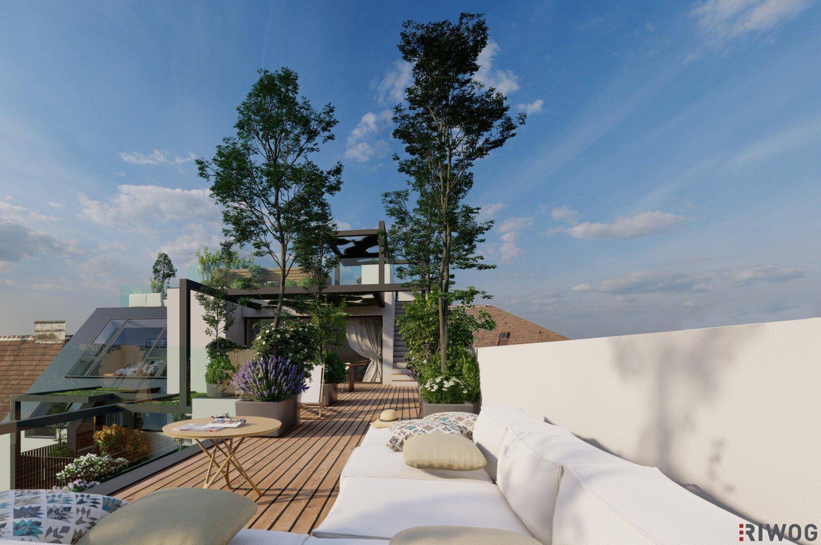Im ersten Dachgeschoss sollen drei Wohnungen, jede mit Außenfläche, realisiert werden. Darüber – im 2. DG – ist ein Penthouse mit drei Schlafzimmern, Lift direkt in die Wohnung, einer Raumhöhe bis zu 2,68 m, einer Terrasse auf Wohnebene und einer Flachdachterrasse mit 360° Blick vorgesehen.