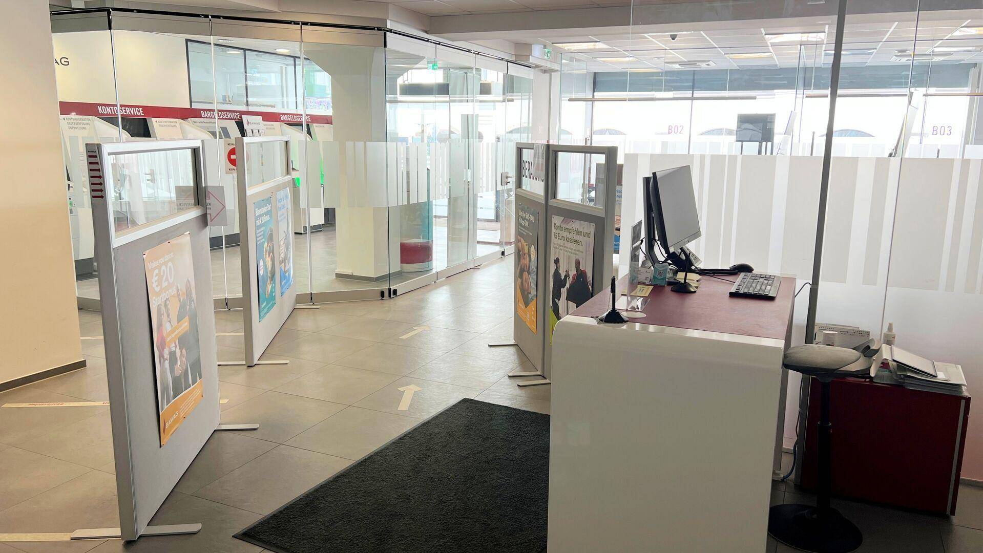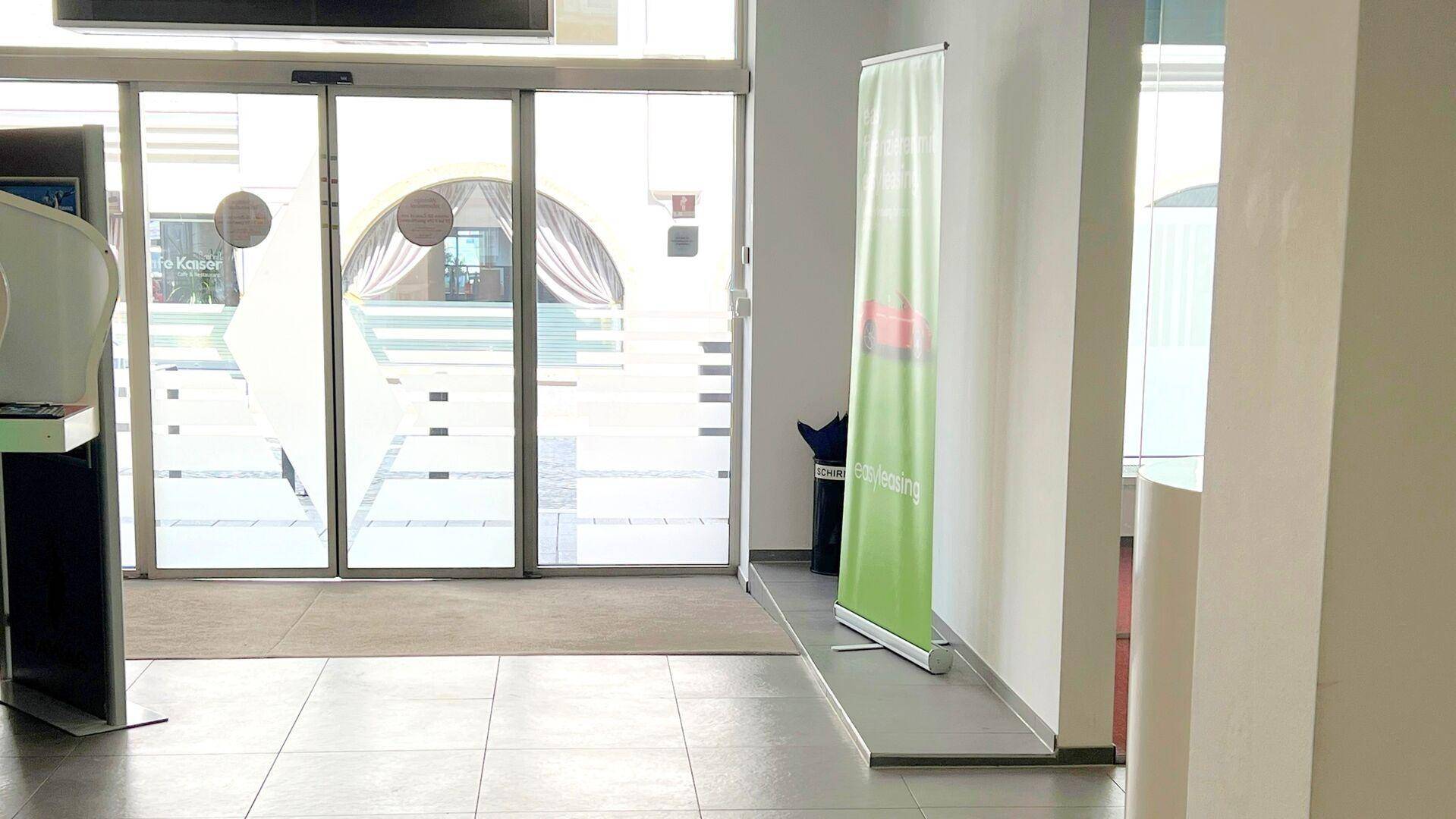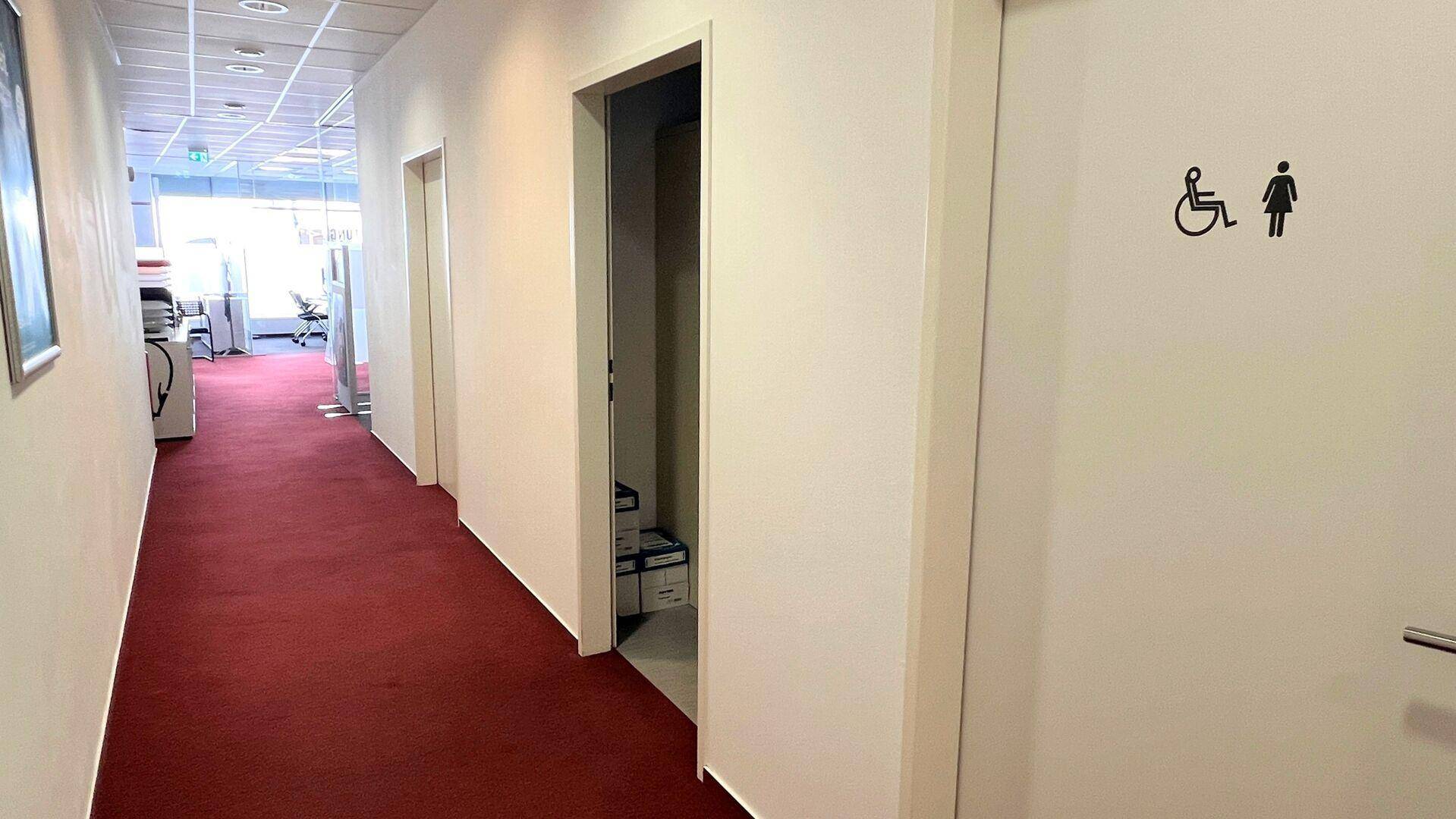 Der barrierefreie Eingangsbereich mit elektrischer Schiebetür hinterlässt einen professionellen Eindruck. Ergänzt wird die Ausstattung durch eine Teeküche, zwei separate WC-Anlagen und fünf private Parkplätze direkt vor dem Objekt.