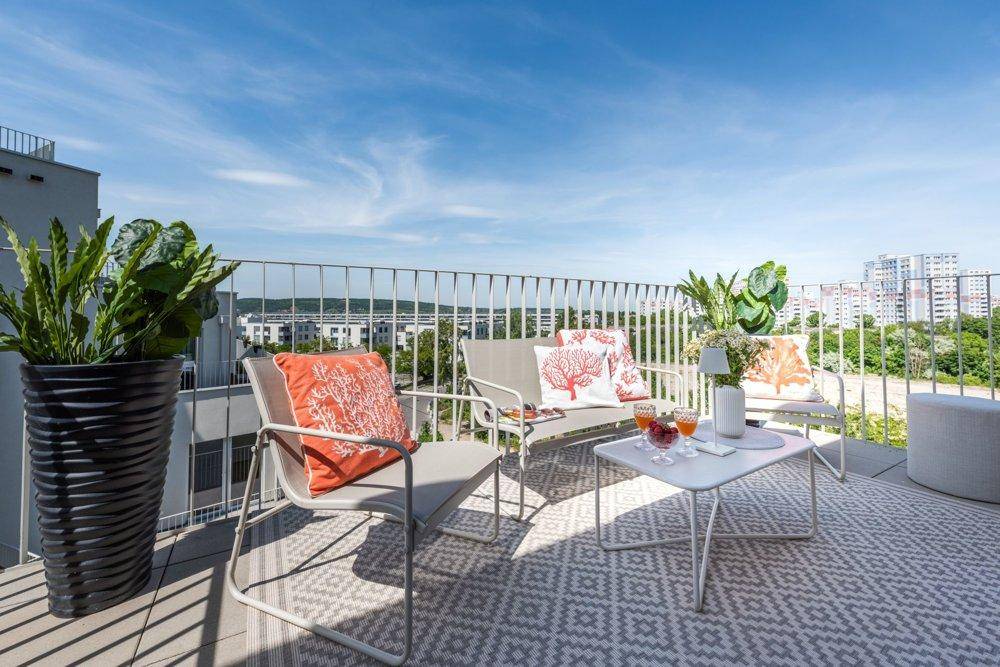 Alle Wohnungen verfügen über Gärten, Balkone, Loggien oder Terrassen. Die nachhaltige Betonkernaktivierung sorgt für Wärme im Winter und angenehmes Raumklima im Sommer.