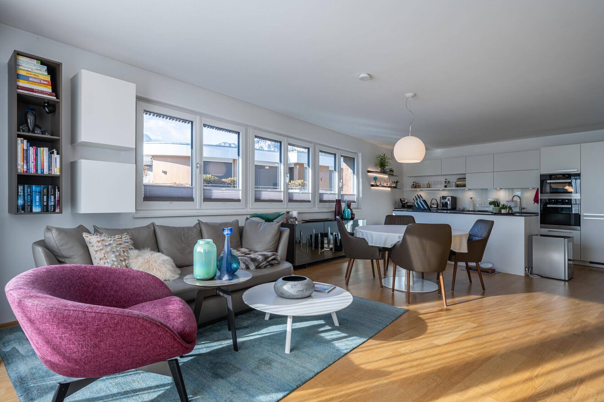 Diese hochwertig ausgestattete 3-Zimmer-Wohnung im Zentrum von St. Johann in Tirol verbindet modernes Wohnen mit einem ausgeprägten Sinn für Design, Komfort und Qualität. Auf rund 98 m² Wohnfläche bietet sie ein stimmiges Gesamtbild für alle, die ein Zuhause mit Charakter suchen – stilvoll eingerichtet, funktional geplant und sofort bezugsbereit. Der großzügige Wohn- und Essbereich mit direktem Zugang zur ca. 9 m² großen Terrasse bildet das Herzstück der Wohnung. Große Fensterflächen sorgen für ein angenehmes Raumgefühl, während die offene Küche nahtlos in den Wohnbereich integriert ist - hochwertig in der Ausstattung, kaum genutzt und optisch wie technisch auf hohem Niveau. Zwei Schlafzimmer sowie zwei geschmackvoll ausgestattete Bäder bieten ausreichend Platz und Privatsphäre. Also ideal für Paare, kleine Familien oder Menschen mit Anspruch an ein komfortables Wohnumfeld. Ein besonderes Highlight: Die komplette Einrichtung ist im Kaufpreis enthalten. Möbel, Ausstattung und Details wurden sorgfältig aufeinander abgestimmt – darunter ein eleganter Bang & Olufsen Fernseher, ausgewählte Designstücke und hochwertige Materialien, die ein stimmiges Wohngefühl vermitteln. Wer möchte, kann hier ohne großen Aufwand sofort einziehen und sich vom ersten Moment an zuhause fühlen. Ein Kellerabteil sowie ein eigener Garagenplatz sind ebenfalls Bestandteil des Angebots. Die Wohnung befindet sich in einem gepflegten Gebäude mit Personenaufzug – bequem und alltagstauglich. Diese Immobilie spricht all jene an, die den Wunsch nach urbanem Wohnen mit einem klaren Anspruch an Stil und Substanz verbinden.