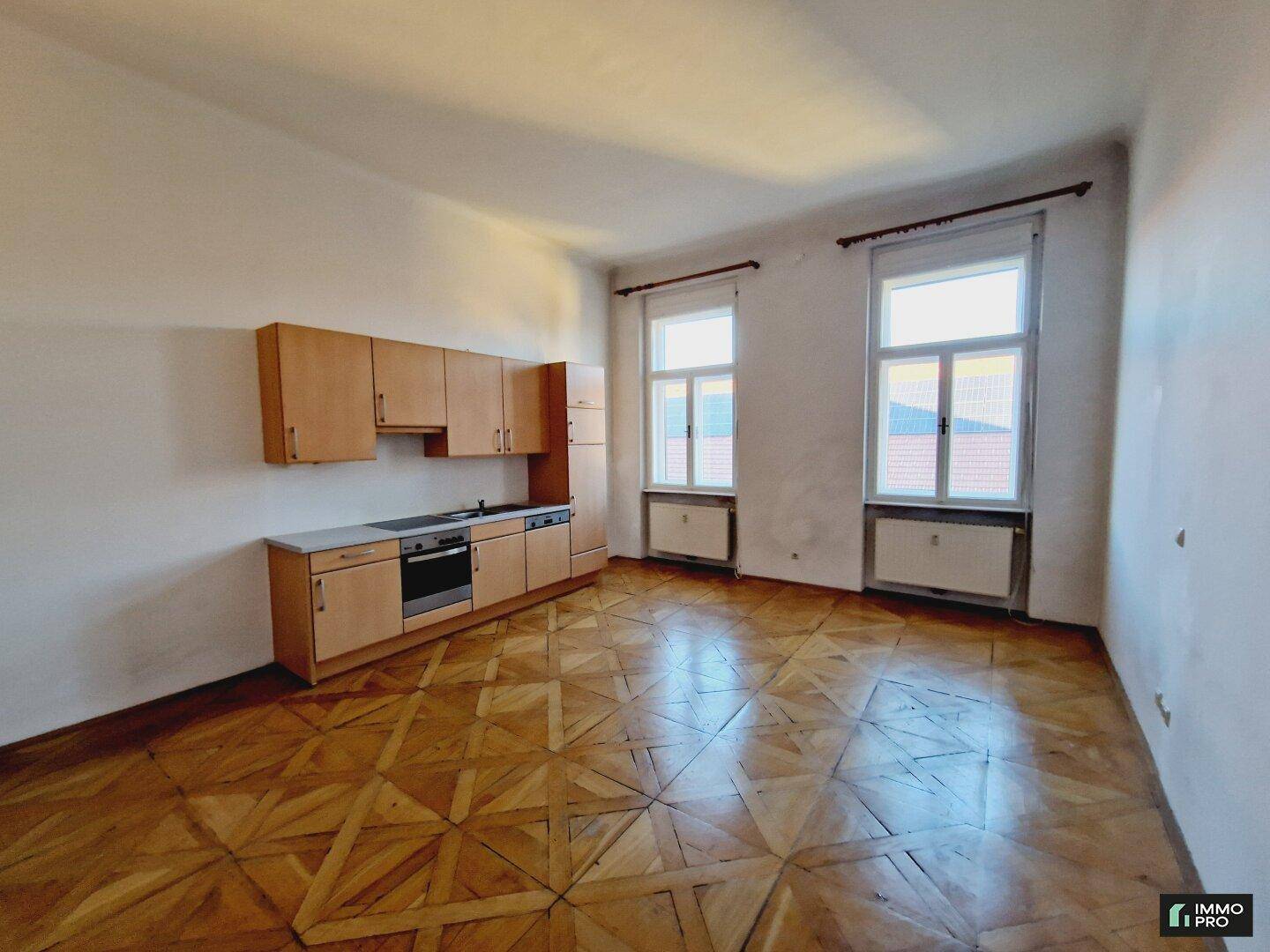 Großzügiger Vorraum, Badezimmer mit Dusche, Toilette, Zimmer mit Küchenzeile.