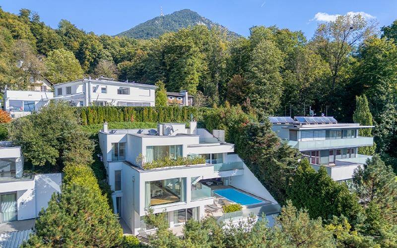 Am Fuße des Gaisbergs erwartet Sie diese moderne Designvilla, die mit unwiederbringlichen Ausblicken auf die Stadt Salzburg und die imposante Bergwelt begeistert. Absolutes Highlight ist der Festungsblick, der Sie beinahe von allen Räumen verzaubert. Hier wohnen Sie umgeben von viel Grün und in gepflegter Nachbarschaft. Die uneinsehbare Ausrichtung garantiert Ihnen ein hohes Maß an Privatsphäre. Sie sind im Nu in der Innenstadt, der Gaisberg mit Wanderwegen und vielen Freizeitmöglichkeiten liegt vor Ihrer Haustür. Der Panoramaglaslift bringt Sie vom Entrée, das mit hochwertigsten Einbauten ausgestattet ist, bequem in alle Stockwerke. Die XL-Glaselementen, die herrliche Aussicht in allen Räumen gekonnt in Szene setzen, verleihen dieser traumhaften Villa eine offene, luftige Wohlfühlatmosphäre. Im ersten Obergeschoß befindet sich ein großzügiger Bereich für Kinder oder Gäste, mit zwei Schlafzimmern und einem modernen Badezimmer, eine Ebene darüber verwöhnt Sie der weitläufige Wohn- und Essbereich mit Zugang auf die Pool-Terrasse. Der Masterbereich im Dachgeschoß mit herrlicher Panoramaterrasse ist Ihr ganz eigener Rückzugsort und Logenplatz – dank großflächiger Verglasungen genießen Sie den grandiosen Festungsblick auch vom Schlafzimmer mit Ankleide en suite und sogar im edlem Bad mit Wanne, Sauna und Walk-In Regendusche. 2 Pkw-Garagenplätze und 2 Freistellplätze stehen zur Verfügung. HWB 56.