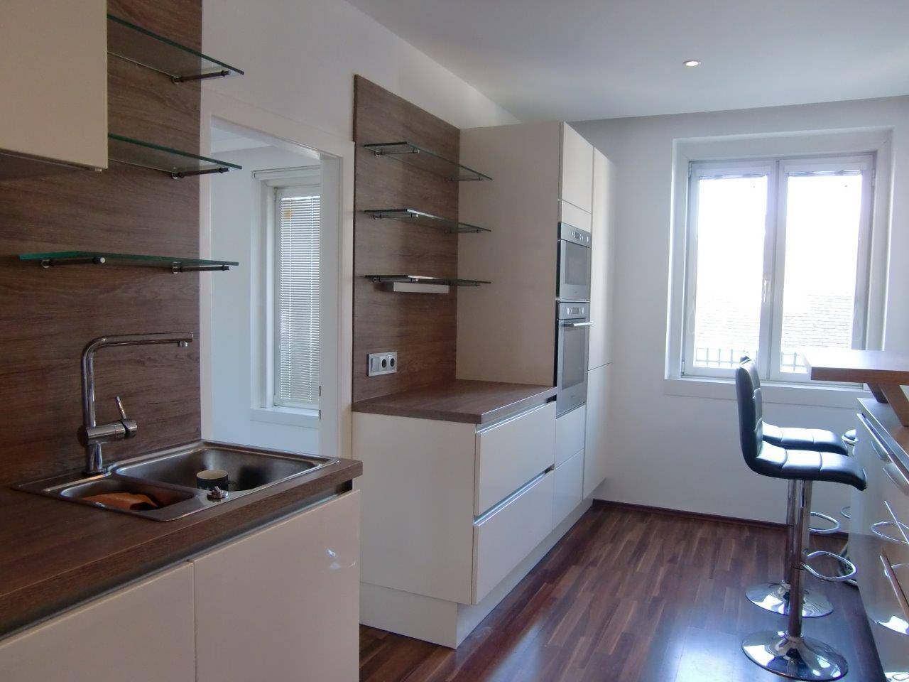 Die Wohnung besteht aus: • einem großzügigen, zentralen Vorzimmer mit raumhohen maßangefertigten Schiebetürenschrank • 2 getrennt begehbaren Zimmer, nämlich einem 20 m² großen Zimmer zur Diesterweggasse mit großem Panoramafenster und einem 21 m² großen Eckzimmer mit Panoramafenster zur Diesterweggasse und einer französischen Balkontür zur Penzinger Strasse mit einem schönen Ausblick auf die gegenüberliegende barocke Rochuskapelle • einem Badezimmer mit Dusche, Waschtisch, Handtuchwärmer und Spiegelschrank • einem WC extra mit AEG Waschmaschine • einer komplett ausgestatteten Küche mit Whirlpool und Bauknecht - Markengeräten wie Geschirrspüler, Backrohr, Herd mit Dunstabzugshaube, einer Mikrowelle, sowie einer Gefrierkombination mit Kühlschrank und Tiefkühlladen Die helle und ruhige Wohnung, die im 3. Liftstock liegt, wurde renoviert und mit einem Vollholz - Parkettboden mit Parkettleisten ausgestattet, es handelt sich dabei um gebürstete und geharzte Eichendielen. Des Weiteren gibt es eine neue Wand- und Bodenverfliesung in den Nassräumen, eine neue Elektrik, neue Heizkörper, neue Fenster u.v.m.