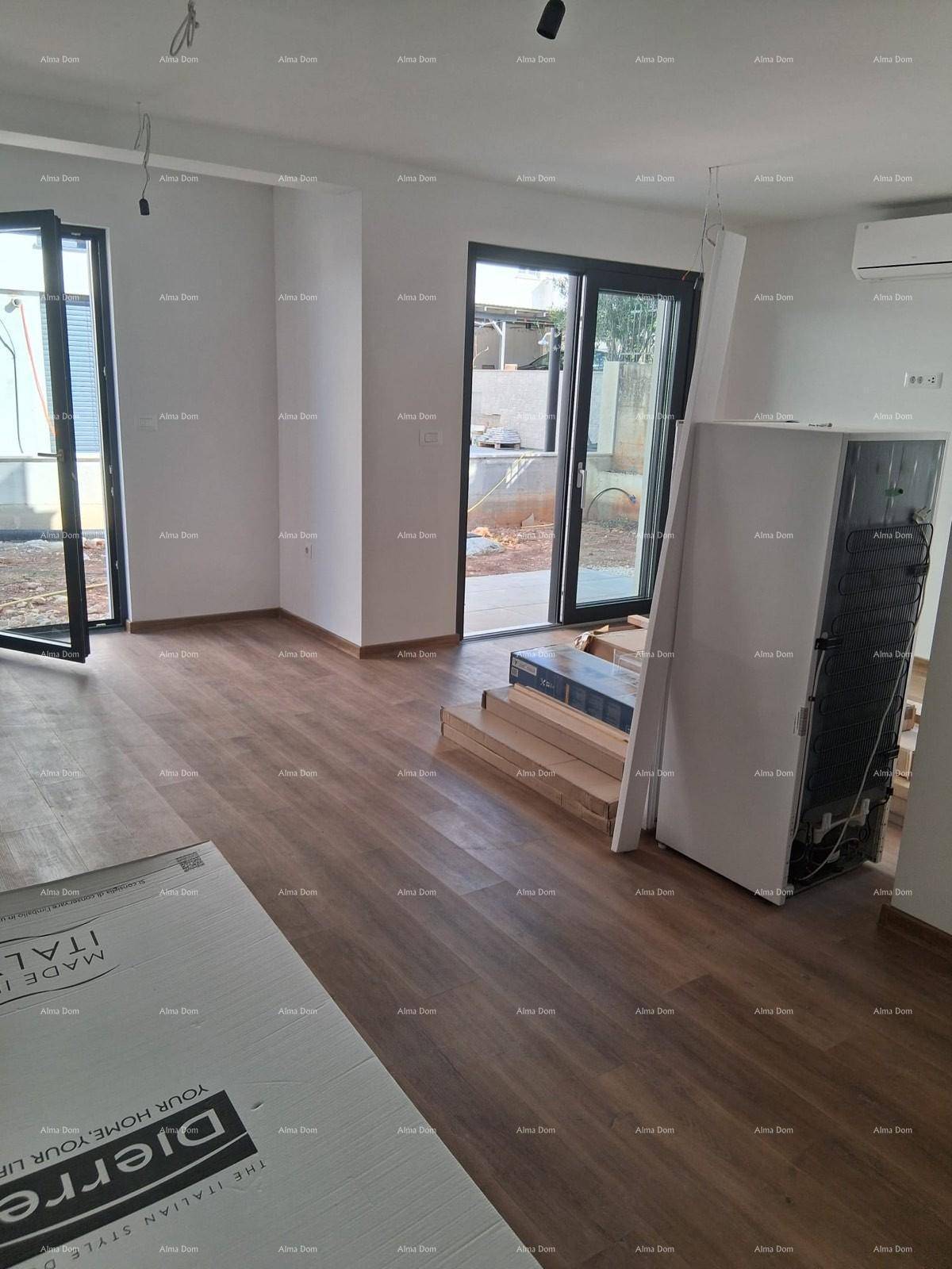 Zu verkaufen ist eine Erdgeschosswohnung in einem Neubau in Medulin mit einer Gesamtfläche von 68 m², einem zugehörigen Garten von 85 m² und einem eigenen Parkplatz. Die Wohnung besteht aus einem Eingangsflur, einem Abstellraum, einem Wohnzimmer mit Küche und Essbereich, zwei Schlafzimmern, einem Badezimmer sowie einer überdachten Terrasse, die in einen schön gestalteten privaten Garten führt.