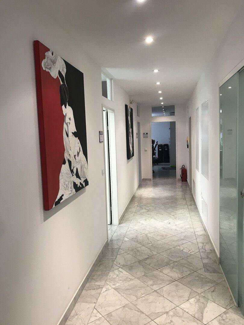 > Komplett ausgestattet mit weißen Schreibtischen samt Rollconttainern (weiß), teilweise Bürostühlen (schwarz), Beleuchtungskörper, komfortablen Einbaukästen bzw. Wandverbauten