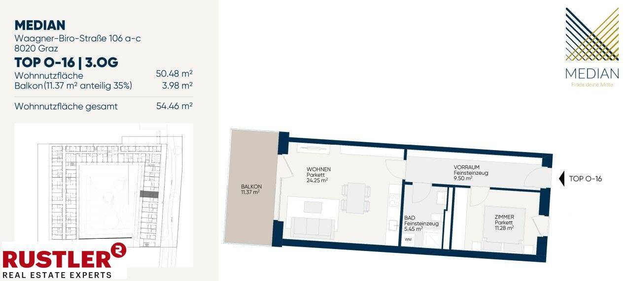 Inmitten des neuen Stadtquartiers "SmartCity“ gelegen, bietet das Projekt Median seinen Bewohnern ein innovatives Gesamtkonzept. Flexible und umweltschonende Mobilitätslösungen sowie erneuerbare Energien stehen im Fokus der Belebung des ehemaligen Industriegebiets nördlich des Grazer Hauptbahnhofs. Mit der Verlängerung der Straßenbahnlinie 6 ins Zentrum des Areals, wurde eine direkte Anbindung zum Grazer Stadtzentrum sowie dem linken Murufer realisiert. Das Naherholungsgebiet Plabutsch sowie verschiedene Wander- und Spazierwege laden zur Erholung im Grünen ein.