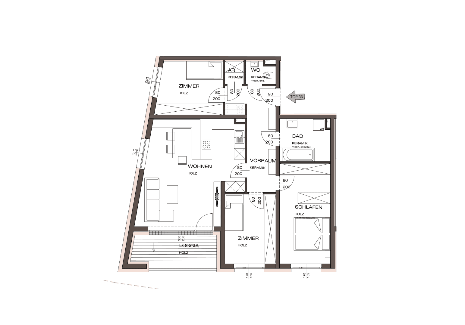 Die ca. 86 m² große 4-Zimmer-Wohnung C33 befindet sich im 2. Stock von Baukörper C und beinhaltet alle Elemente die eine große und moderne Eigentumswohnung haben muss. Ein großzügiger Vorraum, einen Abstellraum, 2 Schlafzimmer, ein Bad mit Badewanne, ein separates WC und eine offen gestalteten Wohnbereich. Das Highlight der Wohnung ist das großzügige Wohnzimmer mit Wohnküche, welches Platz für eine gemütliche Couch, TV-Board und einen großen Esstisch bietet. Anschließend befindet sich die Loggia mit partiellem Blick zum Traunstein.