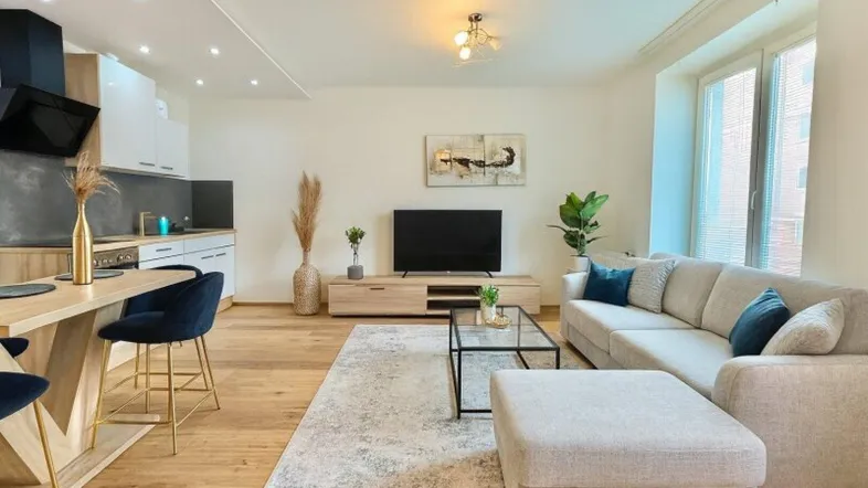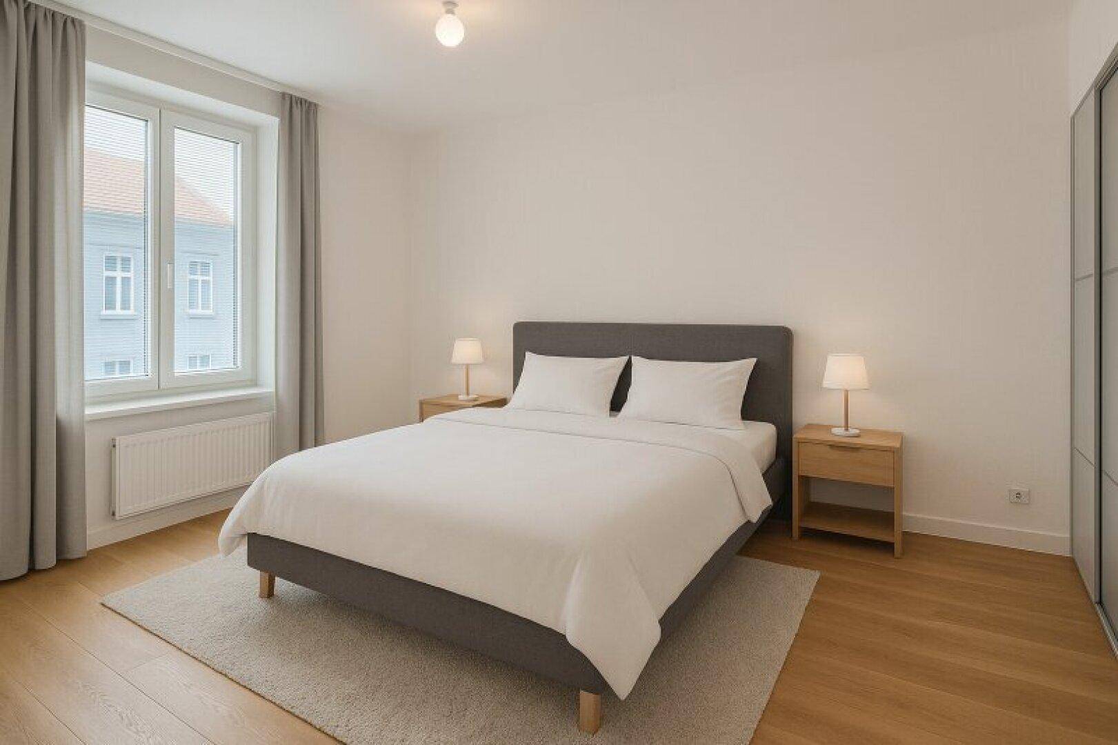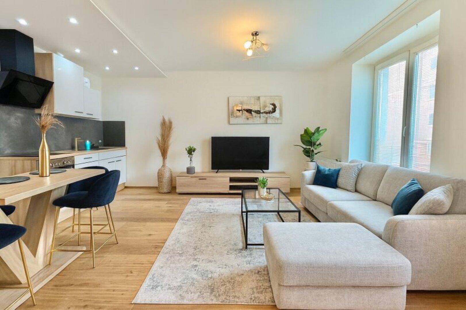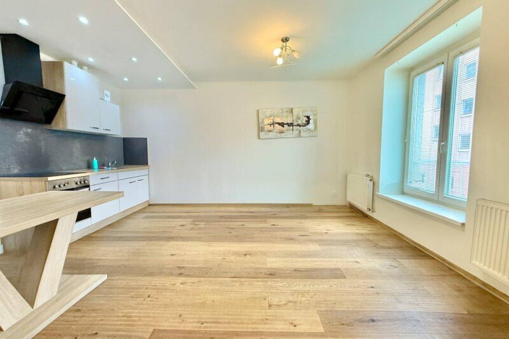 Die Wohnung besticht vor allem durch ihre helle und freundliche Atmosphäre. Der offen gestaltete Wohn- und Essbereich mit hochwertiger Einbauküche lädt nicht nur zum Kochen, sondern auch zum geselligen Beisammensein ein. Der Parkettboden sorgt für ein warmes, stilvolles Ambiente, während das modern verflieste Badezimmer mit Badewanne einen idealen Ort der Entspannung schafft.