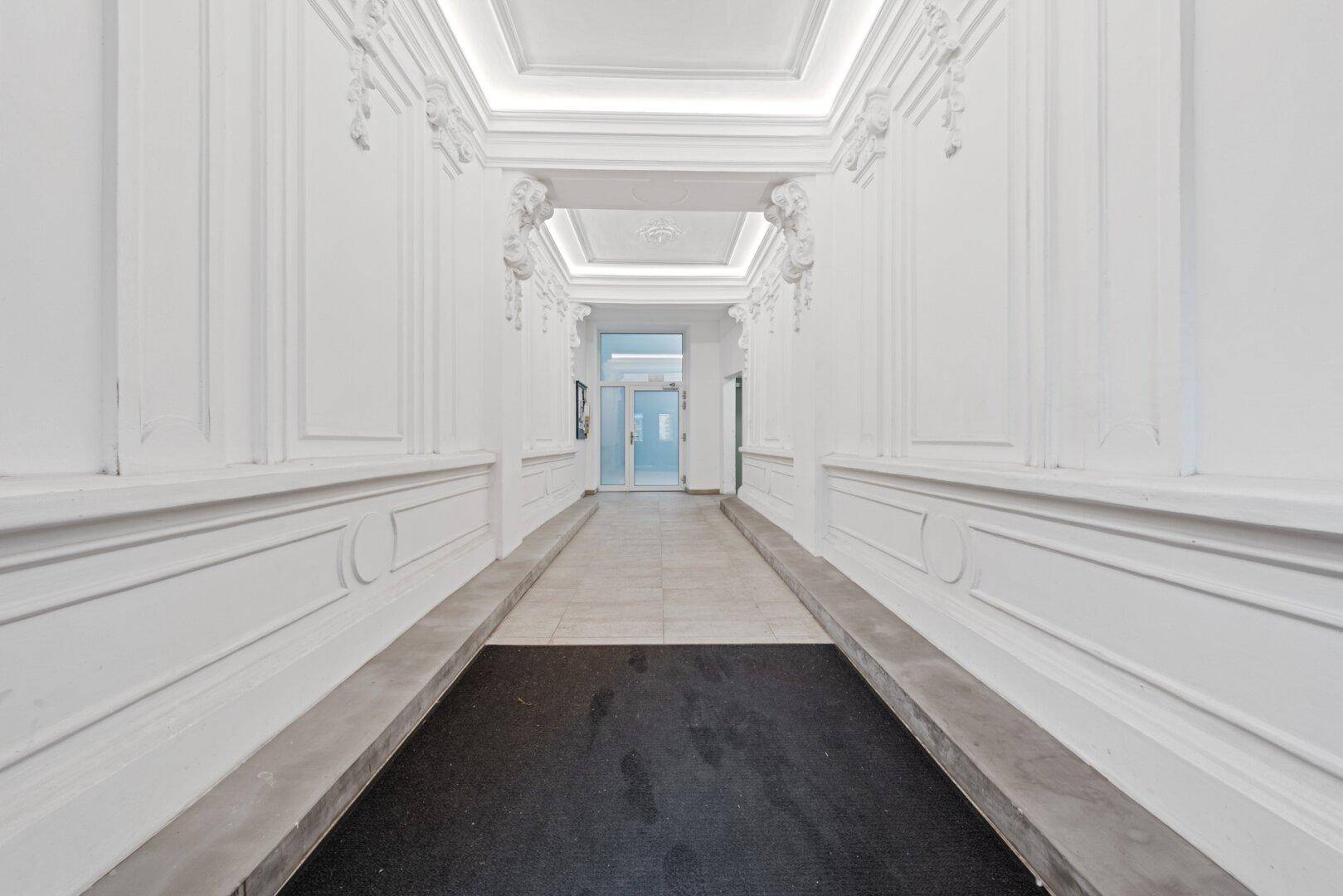 Bereits der repräsentative Hauseingang verspricht Ihnen ein niveauvolles Zuhause, welches sich im Stiegenaufgang fortsetzt.