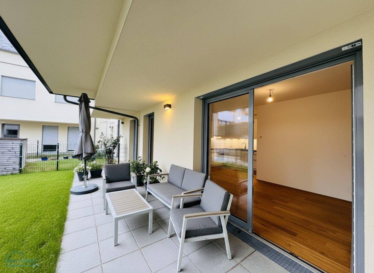 Vorzimmer, Wohn-Esszimmer mit offener Küche und Ausgang auf die Terrasse und in den Garten, zwei Schlafzimmer (beide mit Ausgang auf die Terrasse), Wannenbad mit WC, separates Gäste-WC, Abstellraum mit Waschmaschinenanschluss