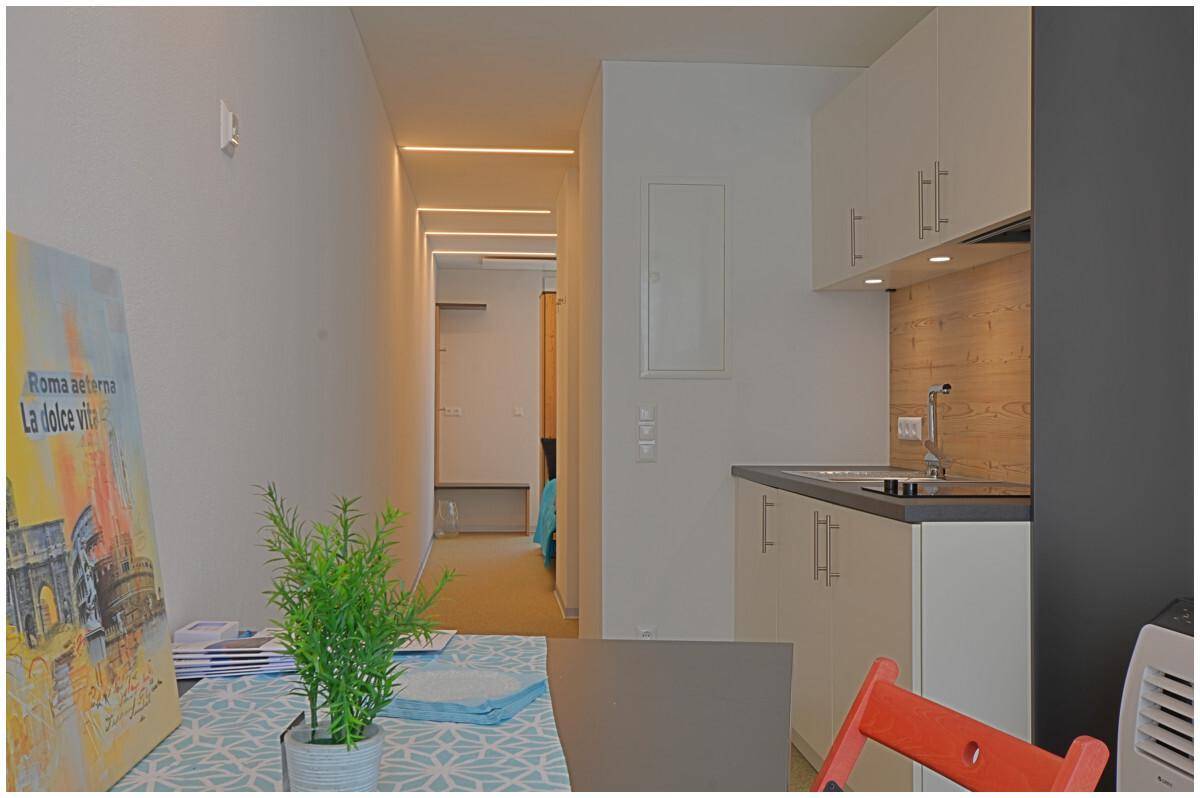 Offenes Wohnkonzept: Der durchdachte Grundriss kombiniert Schlafbereich, Küche und Essbereich in einem harmonischen Raum. Modernes Badezimmer: Begehbare Dusche, hochwertiges Waschbecken und eine stilvolle Toilette sorgen für Komfort und Ästhetik. Terrasse: Genießen Sie Ihren eigenen kleinen Außenbereich – ideal, um den Tag ausklingen zu lassen. Parkplatz: Ein seltener Luxus in zentraler Lage.