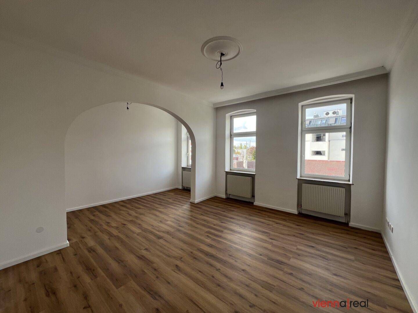 Der zentral gelegene Wohnraum, der mit einem Rundbogen optisch abgetrennt ist, bildet das Herzstück der Wohnung. Von hier aus sind zwei weitere Zimmer erreichbar, die sich ideal als Schlafzimmer, Kinder- oder Arbeitszimmer eignen.