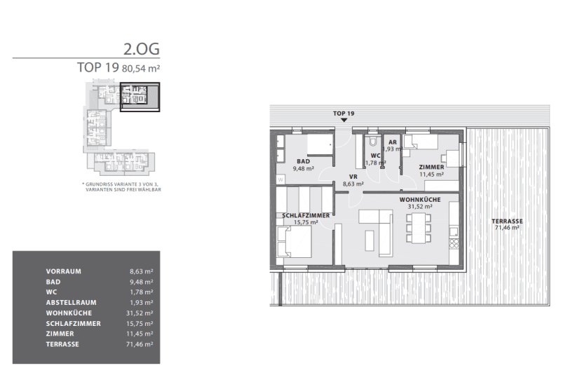 Die Terrassen verfügen über eine Größe von 12 m² bis hin zu 71 m². Das in Massivbauweise gebaute Wohnhaus ist barrierefrei und bietet einen Lift. Weiters erfolgt die Beheizung mittels Fußbodenheizung über eine Luftwärmepumpe.