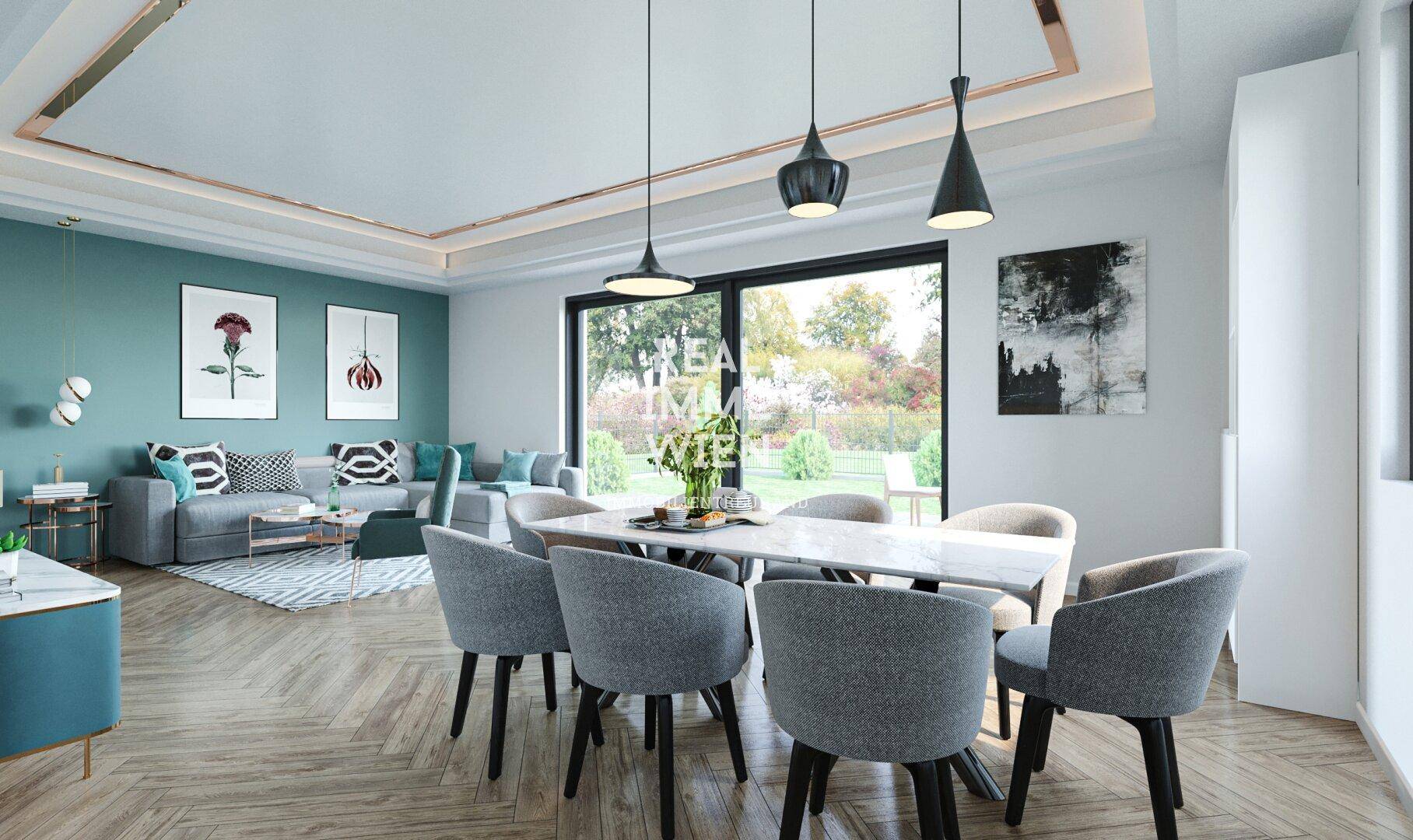 Im Erdgeschoß befinden sich Vorraum inkl. Garderobenbereich, das großzügige Wohn-/Esszimmer mit Küche, (Küche ist nicht dabei), und Kamin, ein Technikraum mit Stauraum und das WC.