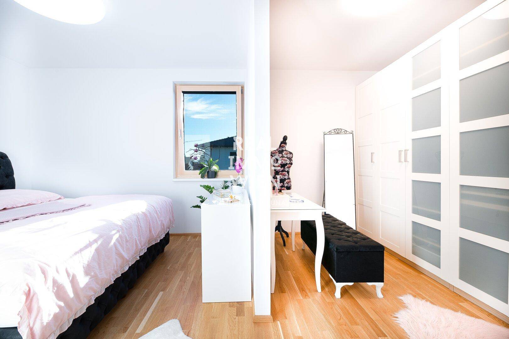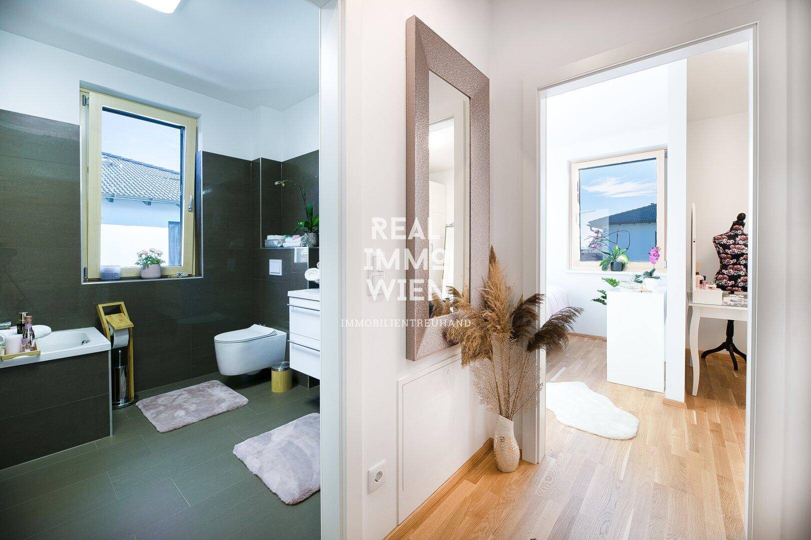 Im Obergeschoß sind ein Schlafzimmer mit begehbarer Garderobe, zwei weitere Schlafzimmer inkl. Balkon, und ein großes Badezimmer mit Fenster, Toilette, Dusche und Badewanne.