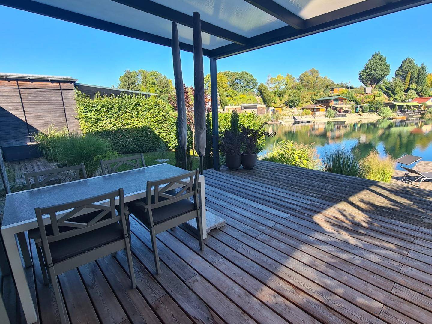 Die Grundstruktur bildet ein Skelettbau aus Massivholzkomponenten, ergänzt durch eine vorgesetzte Holzfassade und eingehängte Elemente. Großzügige Fixverglasungen, Fenster, Türen, Vordächer und Balkone schaffen fließende Übergänge zwischen Innen- und Außenraum und integrieren den Lebensraum am See perfekt. Besonderes Highlight ist die großzügige, teils verglaste Lärchenterrasse mit direktem Zugang zum Wasser, ergänzt durch einen freitragenden Steg – ein einzigartiger Platz, um Sonnenuntergänge direkt am See zu genießen.