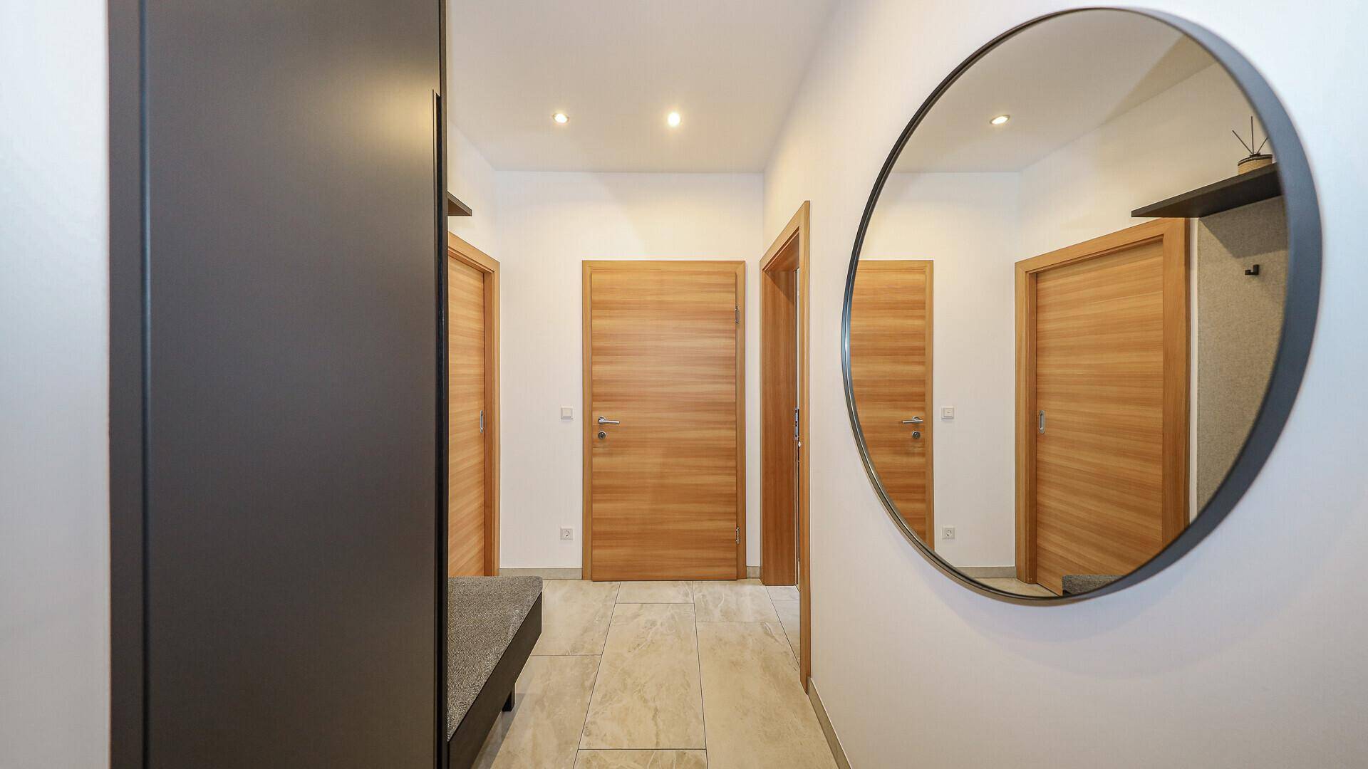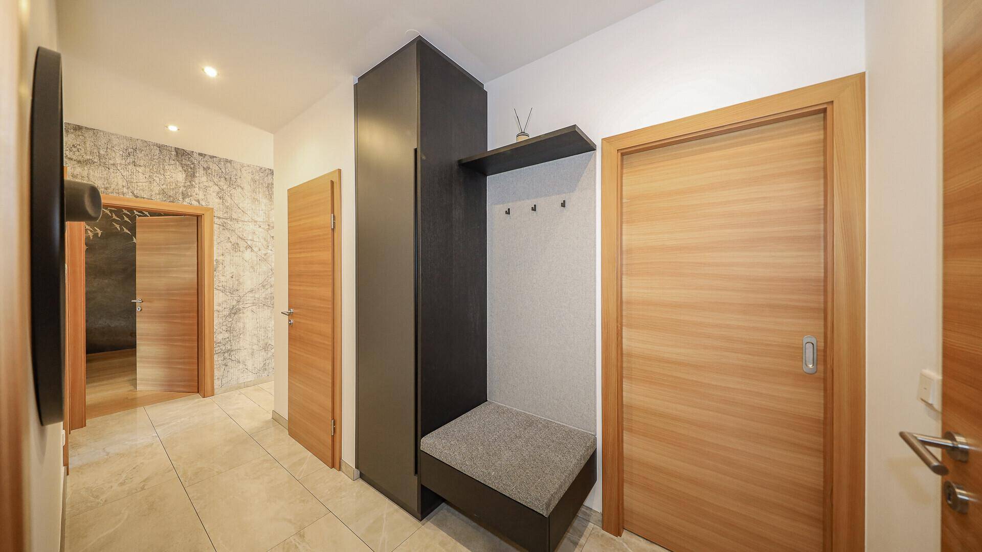Vom Erdgeschoss, wo 1 Carport- und 1 Garagenstellplatz zum Penthouse gehören, gelangt man über das Treppenhaus in die oberste Etage und betritt sodann die geräumige Garderobe mit Abstellraum und Gäste-Toilette. Weiters verfügt das Penthouse über ein Masterschlafzimmer, zwei weitere Schlafzimmer und ein komfortables Badezimmer mit Dusche und Badewanne sowie Waschmaschinenanschluss. In einem Schlafzimmer ist eine hochwertige Klafs-Sauna verbaut.