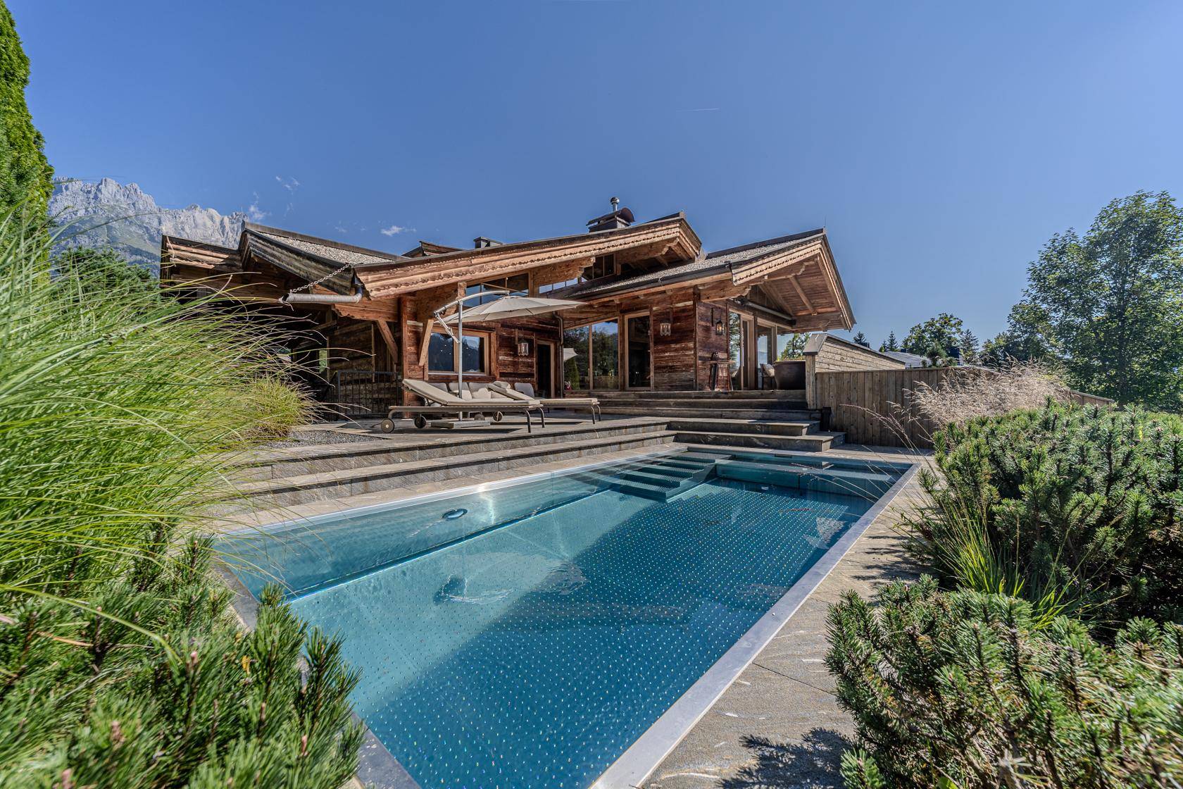 Besondere Highlights stellen die zwei luxuriösen Master-Schlafzimmer im Ober- bzw. Untergeschoss, mit großen Badezimmern en suite sowie Ankleiden dar, die den direkten Zugang zum Balkon bzw. zur Terrasse ermöglichen. Zwei weitere, wunderschön gestaltete Schlafzimmer befinden sich in der unteren Ebene und auch hier erreicht man den Garten über die Terrasse. Zusätzlichen Luxus erleben die Bewohner des Bergchalets durch Annehmlichkeiten wie den gemütlichen Weinkeller, das großzügige Heimkino mit Bar und den sensationellen Wellnessbereich. Sommer wie Winter lädt dieser perfekte Ort zum Entspannen ein und bietet eine Sauna, eine Dampfsauna sowie eine Spa-Dusche und den direkten Zugang zum edlen Außenpool. Einladende Sonnenterrassen auf mehreren Ebenen, ein großer Balkon mit Südausrichtung sowie ein Lounge-Bereich mit BBQ-Platz lassen die wunderbare Aussichtslage mit Privatsphäre auch im Freien genießen.