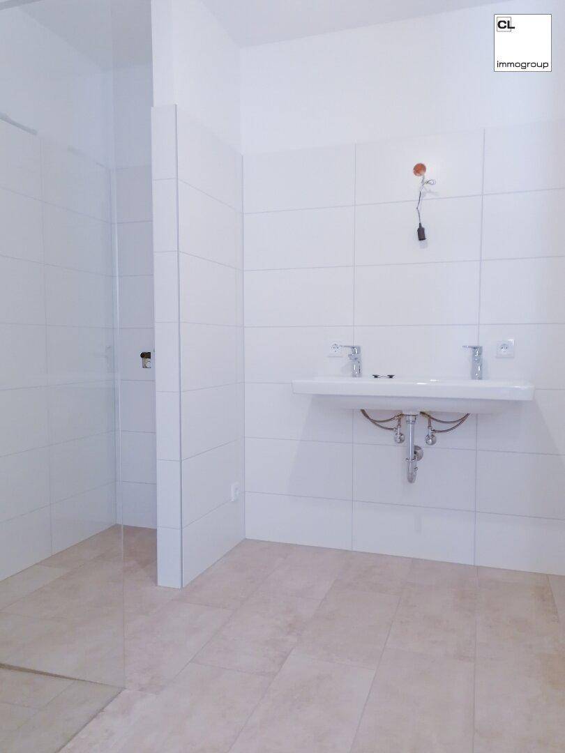 Zudem verfügt das Badezimmer über eine große Duschkabine und eine Vorkehrung für eine Waschmaschine.
