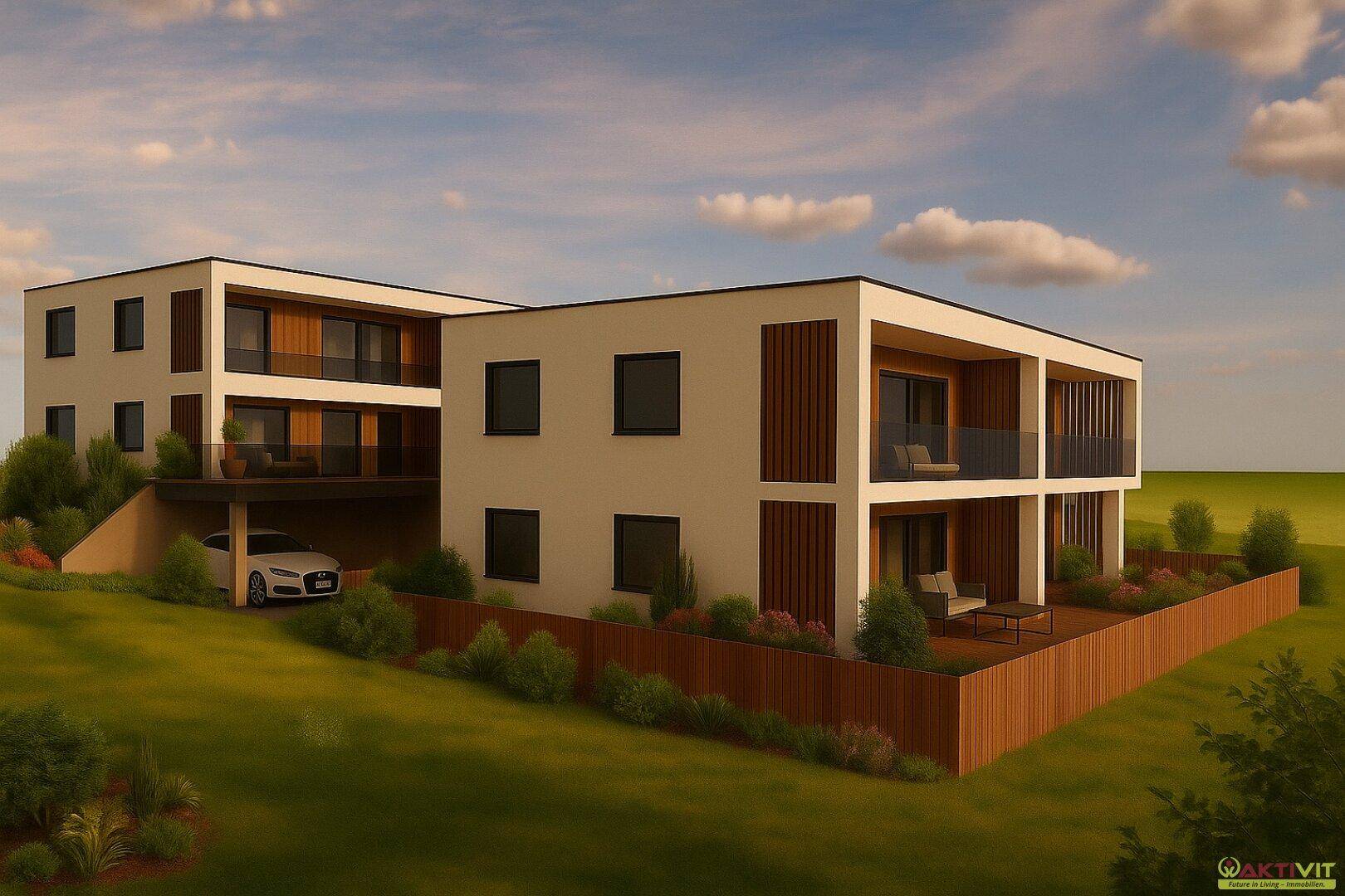 Optional ist eine PV-Anlage möglich. Eine Vorbereitung für E-Mobilität an den Stellplätzen ist Teil des Konzepts. Mobiliar oder fixe Einrichtungen sind nicht im Angebot enthalten.