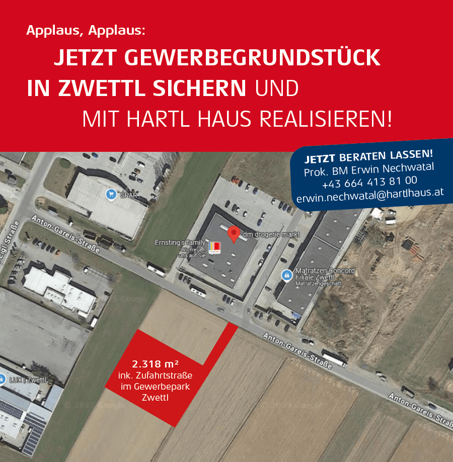 Realisieren Sie Ihr Bauprojekt auf 2.319,30 m²! In bester Lage im Gewerbepark Zwettl bieten wir ein exklusives Grundstück zum Verkauf – perfekt geeignet für Ihr zukünftiges Büro- oder Betriebsgebäude. Die Bebauung erfolgt ausschließlich mit einem individuell geplanten Gebäude von HARTL HAUS. Preis auf Anfrage