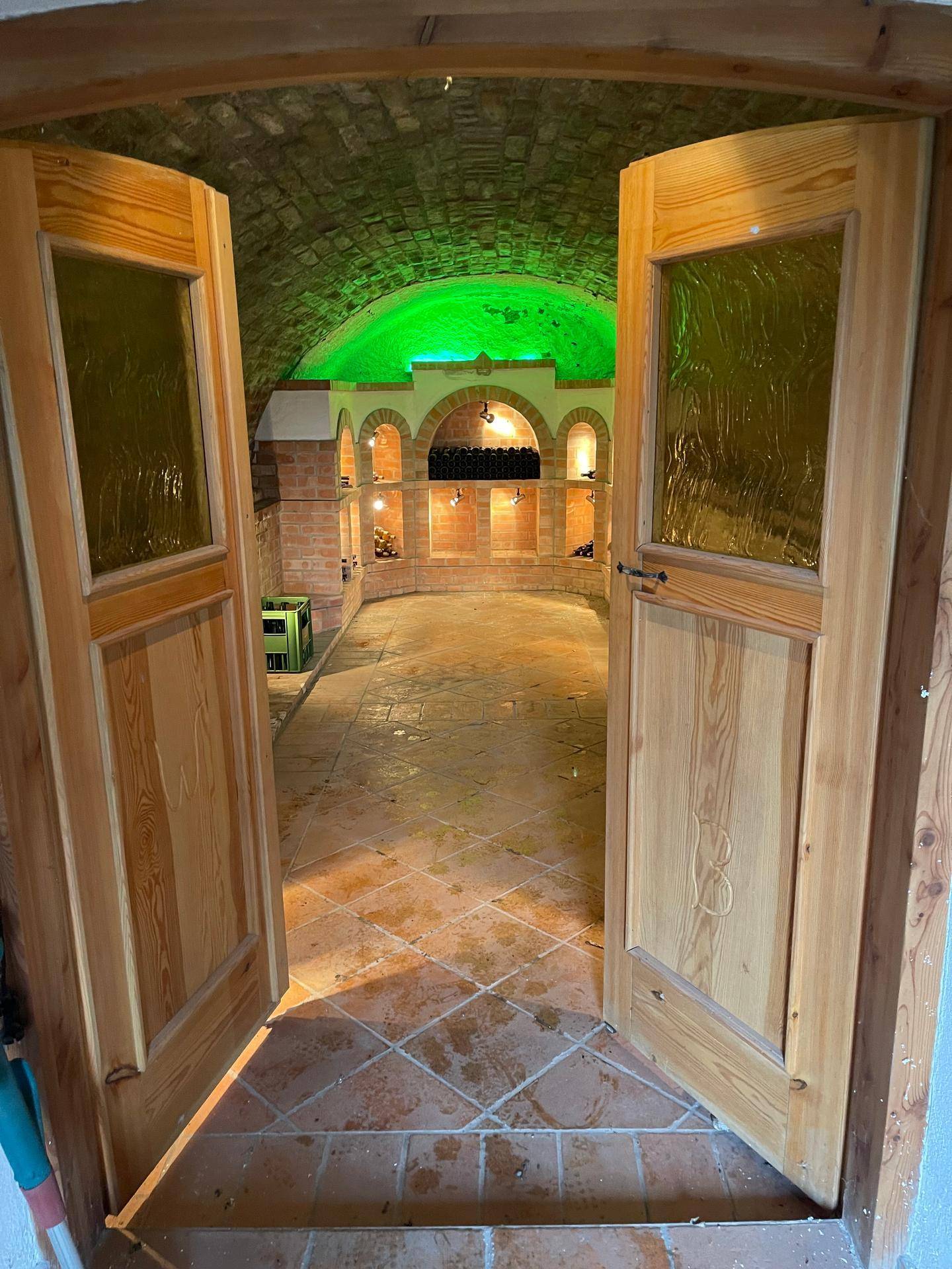 Der charmante Gewölbe-Weinkeller besticht durch sein märchenhaftes Ambiente und eine stimmungsvoll indirekte Beleuchtung, die den historischen Charakter des Raumes harmonisch unterstreicht.