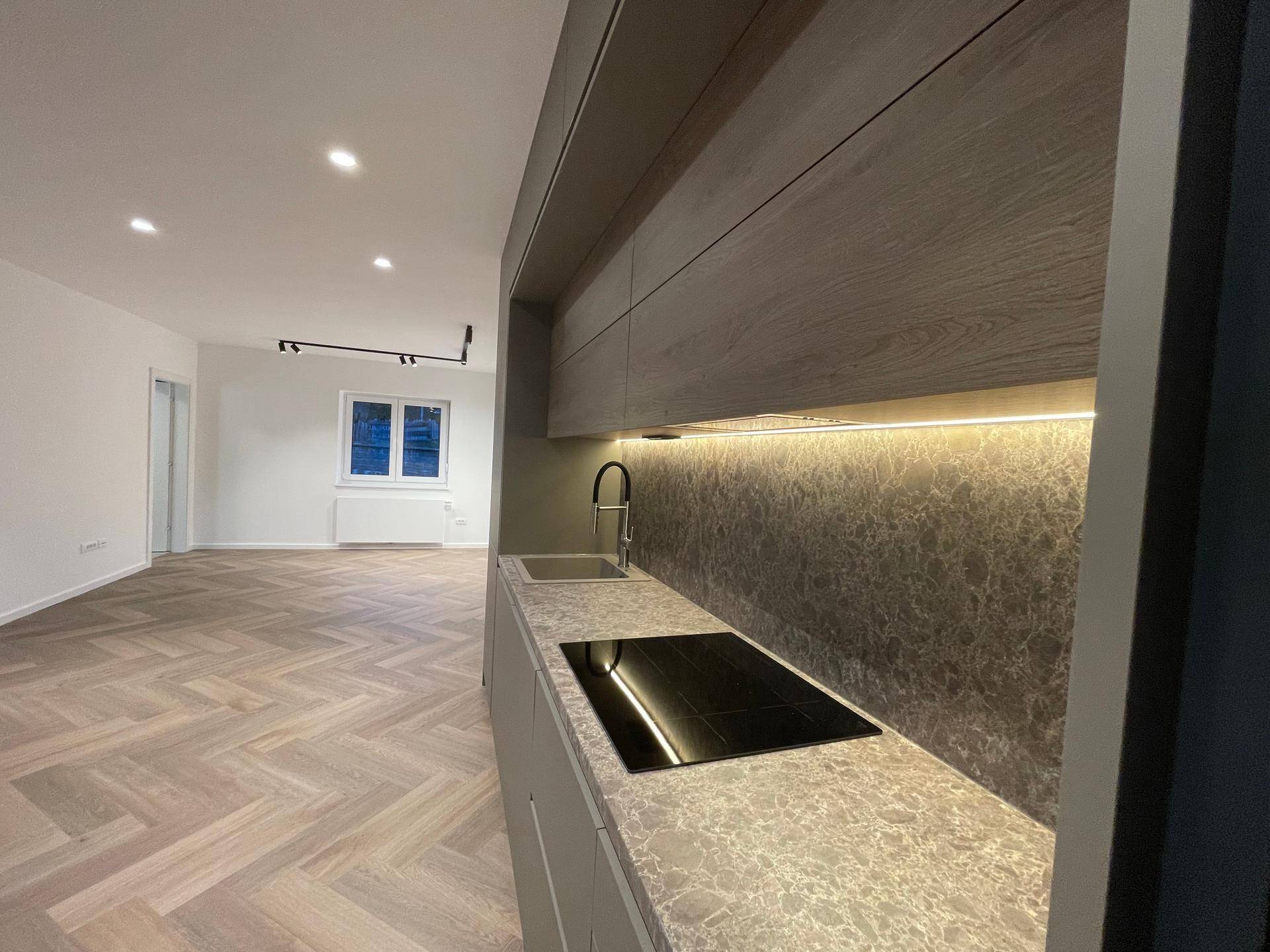 Jede Wohnung verfügt über eine neue und maßgefertigte Küche, die mit hochwertigen Bosch-Geräten ausgestattet ist, darunter ein großer Kühlschrank mit Gefrierfach, ein Induktionskochfeld, ein selbstreinigender Backofen und ein Geschirrspüler. Jedes Badezimmer verfügt über eine bodengleiche Dusche mit Duravit-Duschkopf, Wasserhahn und Toilette. Die Fußbodenheizung im Badezimmer ist von Danfoss Fast Electric und kann manuell oder über WLAN geregelt werden. Alle Leuchten (außer Esstisch- und Nachttischlampen) sind installiert. Die gesamte Beleuchtung ist mit LEDs ausgestattet und größtenteils dimmbar. In den Schlafzimmern und im Wohnzimmer befinden sich LED-Streifen. Im jedem Wohnzimmer sind bereits Kabelanschlüsse für das Entertainment-System sowie Kabel-TV-Anschlüsse für Wohnzimmer und Schlafzimmer installiert. Die Böden in den Zimmern sind strapazierfähige LVF-Vinylböden (Luxus-Vinylboden) der Klasse C43.