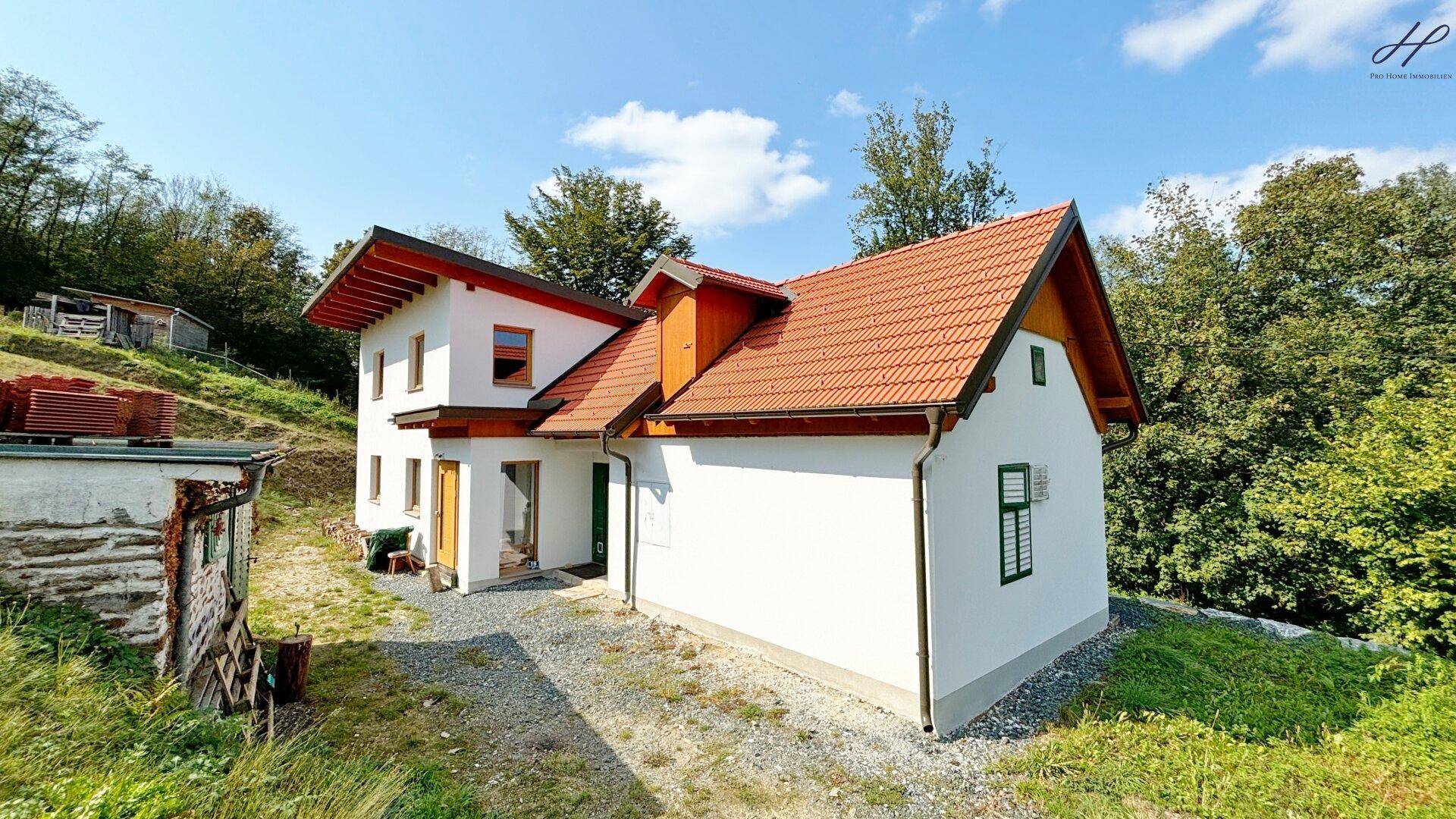 Einfamilienhaus mit 130m² Nutzfläche auf 3.879m² Grundstück in Hanglage unterteilt in die Widmung in ca. 450m² "Bauland - Wohngebiet" und der restlichen Fläche von 3.429 m² in "Grünland".