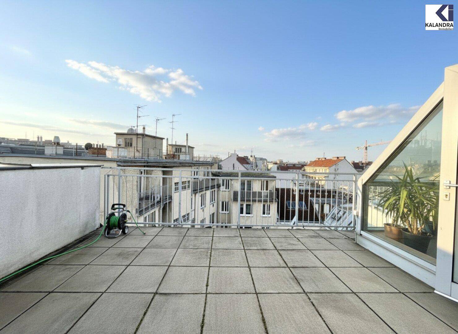 über einen Wintergarten Ausgang auf eine Dachterrasse mit ca. 28m² und 360°- Fernblick über die umliegenden Dächer.