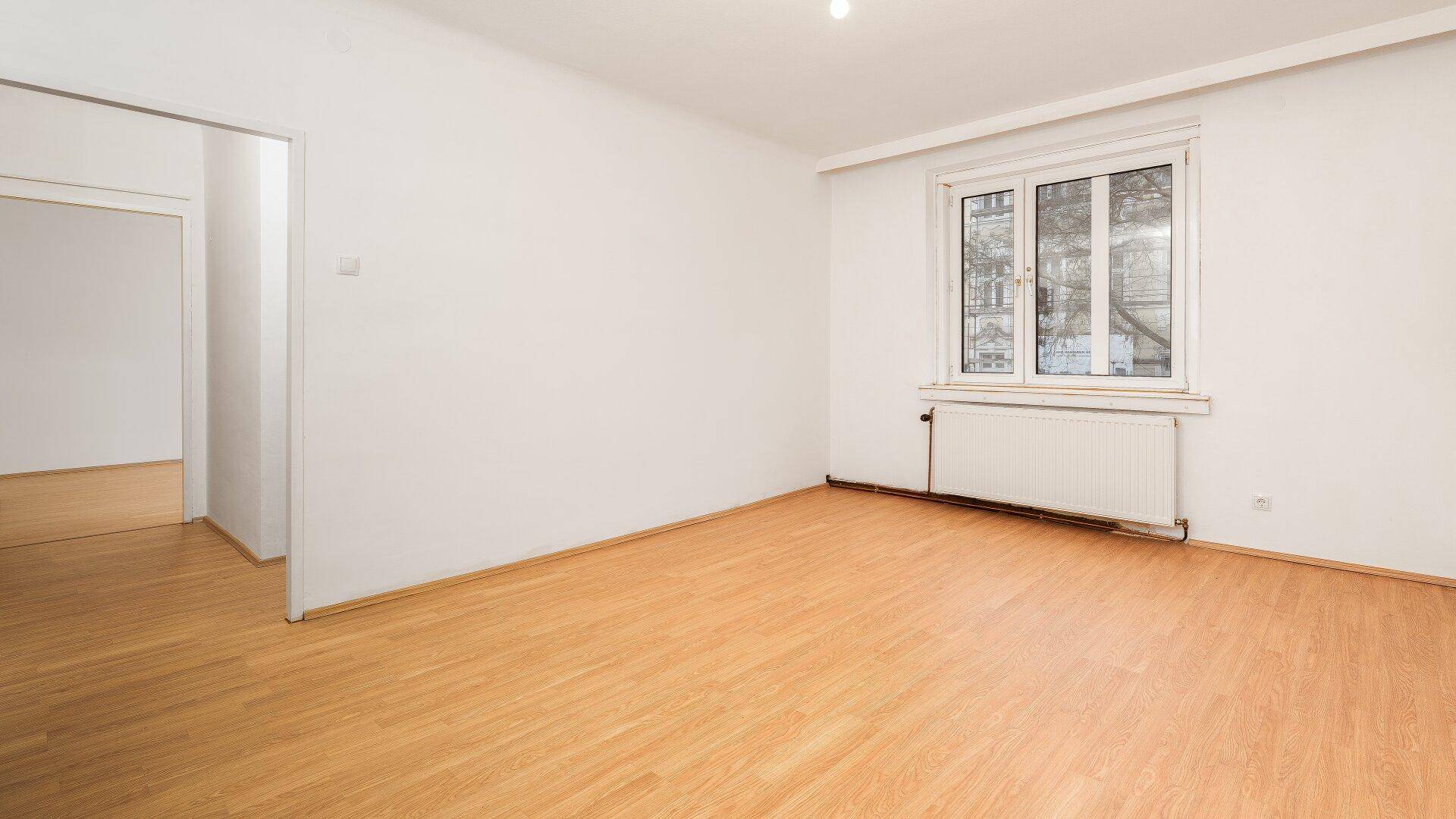 Linker Hand kommt man in den Raum mit Küchenzeile, welcher als Wohnküche oder optional als Küche mit Essbereich dienen kann und eine Ecke als zusätzliche Bürofläche nutzbar bleibt. Gerade aus liegt das WC an dem vorbei das Badezimmer angeschlossen ist. Rechter Hand befindet sich der größte Raum. Dieser könnte als schönes Wohn-Schlafzimmer oder reines Schlafzimmer mit Platz für sehr viel Stauraum erstrahlen.