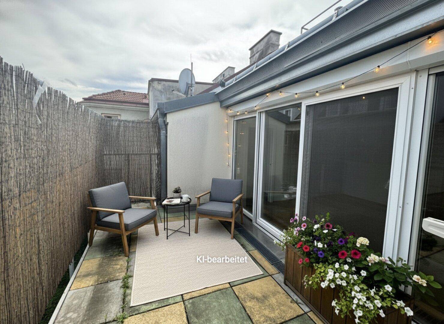 Die rund 14 m² große Terrasse ist zum ruhigen Innenhof ausgerichtet und stellt einen angenehmen Rückzugsort im Freien dar.